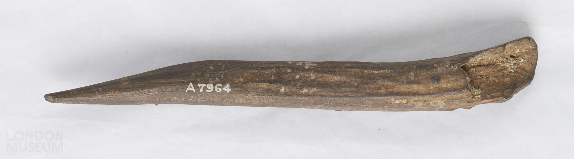 A borer made of stag horn. Base broken off. Fluted design on the sides. Weathered and scratched.
