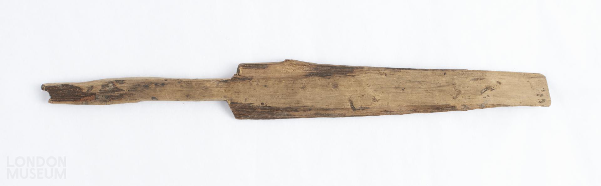 Wooden spatula with wide, flat blade. Narrow handle, roughly rectangular in section and broken off at the end. Blade twisted and warped slightly at its end. Wood cracking and warped.