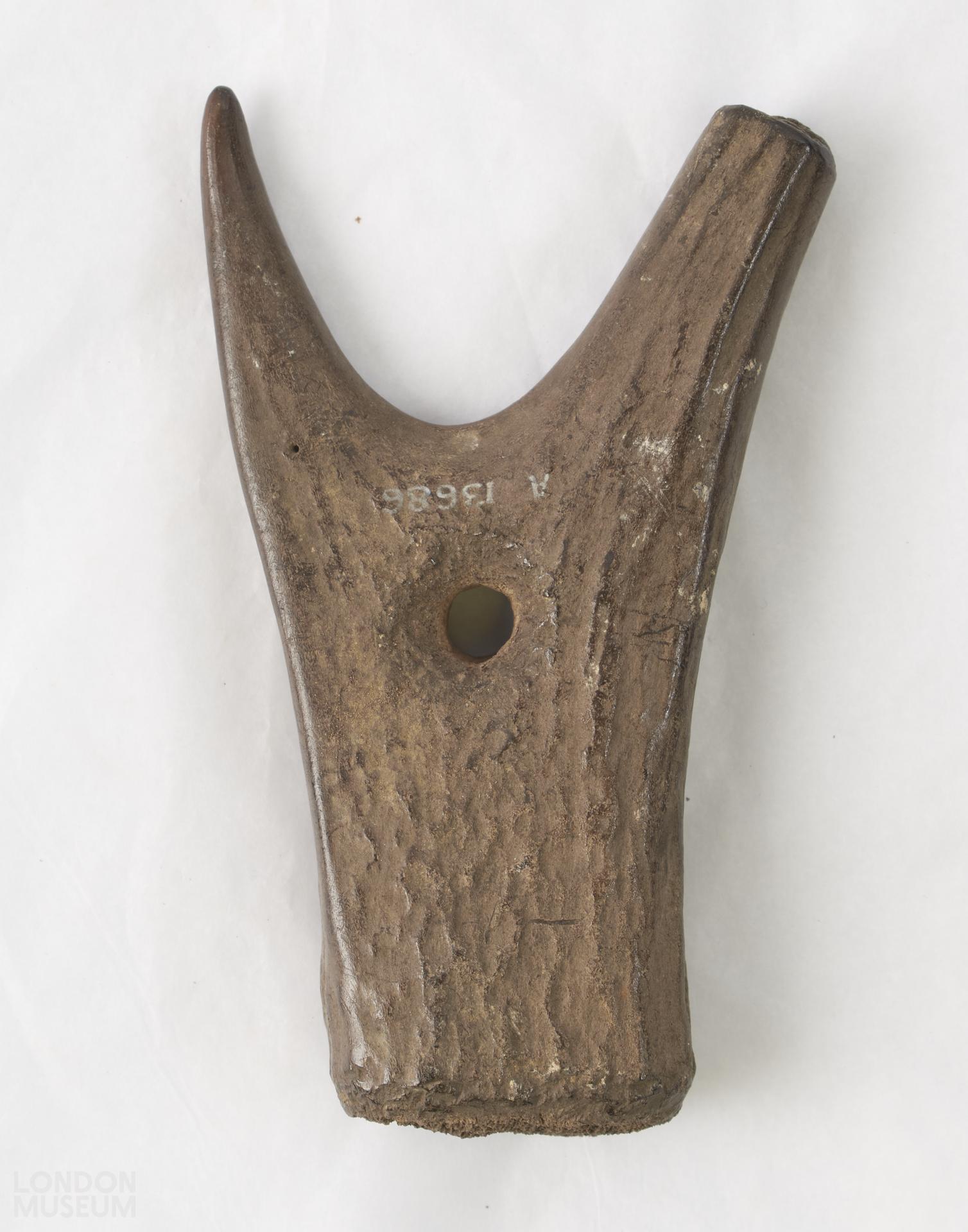 An implement or ornament made of stag horn with a roughly made perforation. There are cut marks on the base. Forked, one side of the fork has broken off.