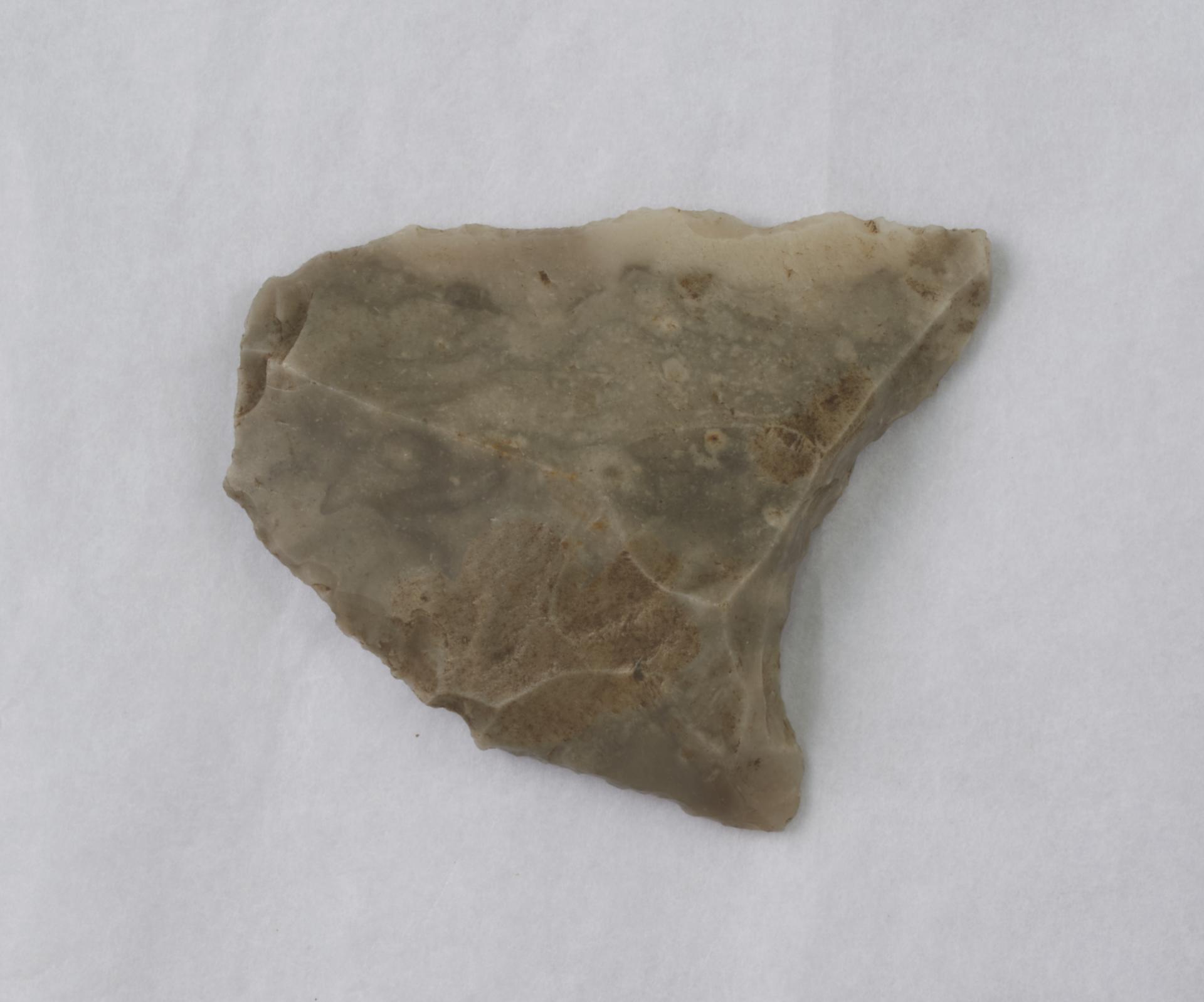 Irregular shaped hollow scraper made of flake grey flint. Retouch along the sharp edges. Signs of cortication on surface.