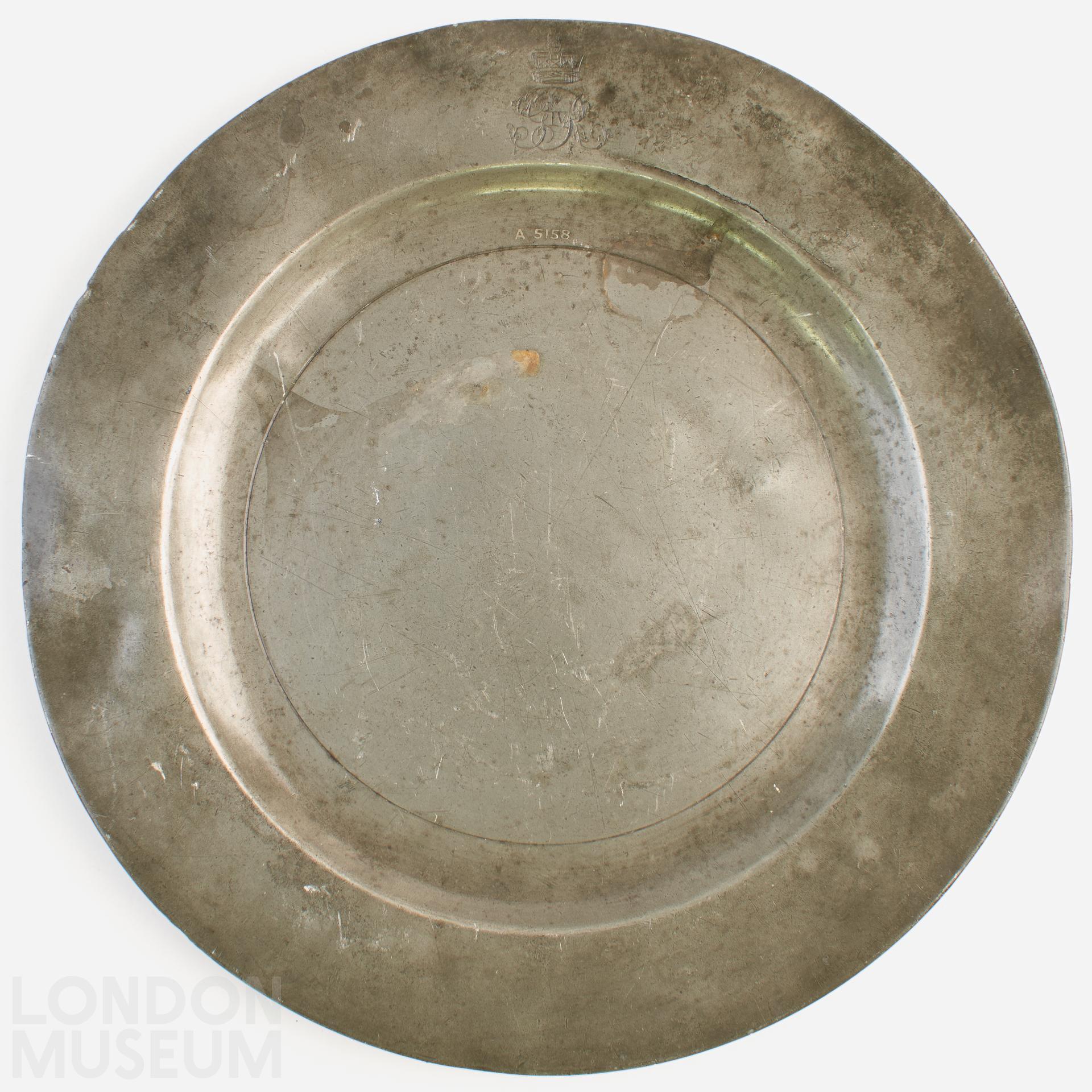Pewter plate, with the rim engraved with a crowned ‘GivR’ cypher for King George IV, and is reinforced on the underside. No visible touch. Date: early 19th century.