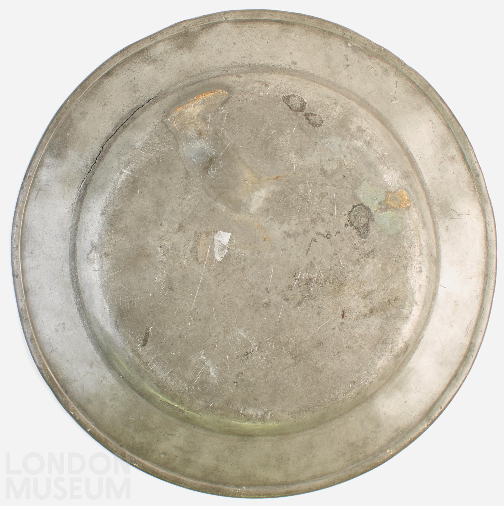 Probably a ‘trophy prize’ taken by one of the guests at the Coronation Banquet of George IV on 19th July, 1821. At the end of the banquet diners ‘arms were everywhere seen stretched forth breaking and destroying table ornaments, which were of themselves too cumberous to remove, for the puprose of obtaining some trophy commemorative of the occasion.’ This included the pewter plates, dishes and salts suitably ‘engraved with the Royal Arms and the letters “Geo.IV” [or as here,“GivR”] in ornamented script’. The pewter was made by Thomas Alderson, OP40, – active from c. 1796-1825. See also Acc. no. O2686.