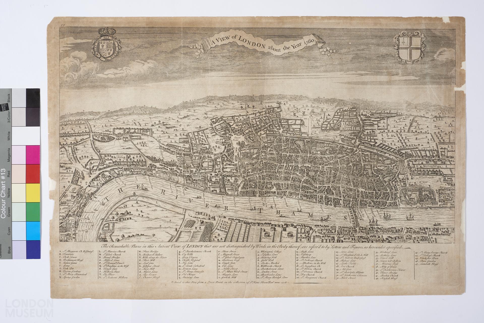 Map titled: "A view of London about the year 1560", reproduced from a large print in the collection of Sir Hans Sloane, 1738. This plate probably from Maitland's 'History of London'.