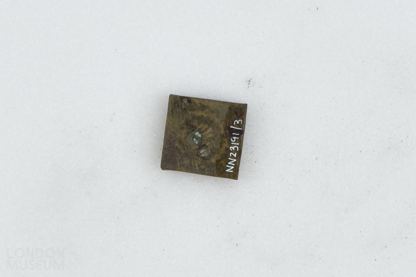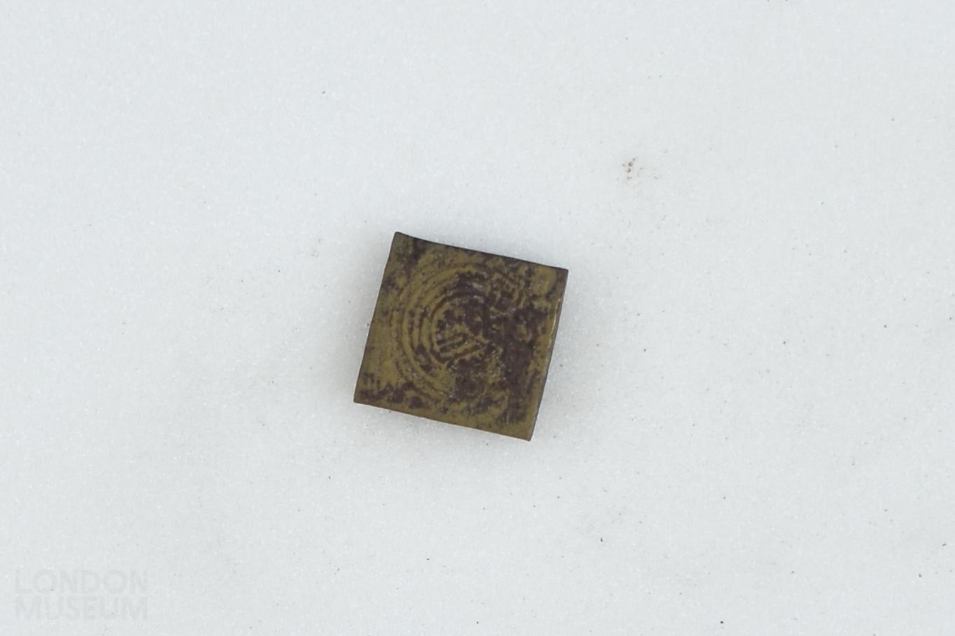 Square copper alloy weight. One face stamped with an open hand, which is the mark of Antwerp, Belgium.
