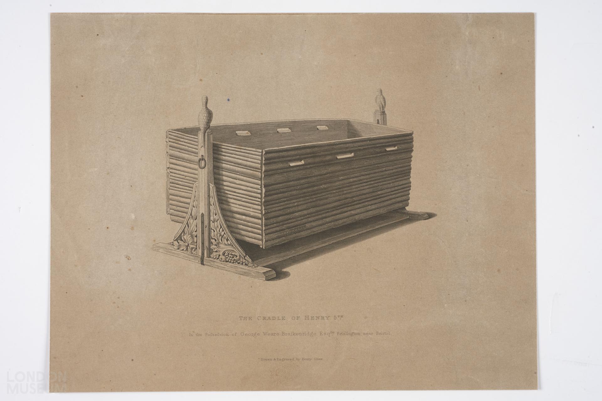 Print of The Cradle of King Henry 5th. A box-like cot swinging in a carved frame. 'In the possession of George Weare Braikenridge Esq're Brislington near Bristol'.