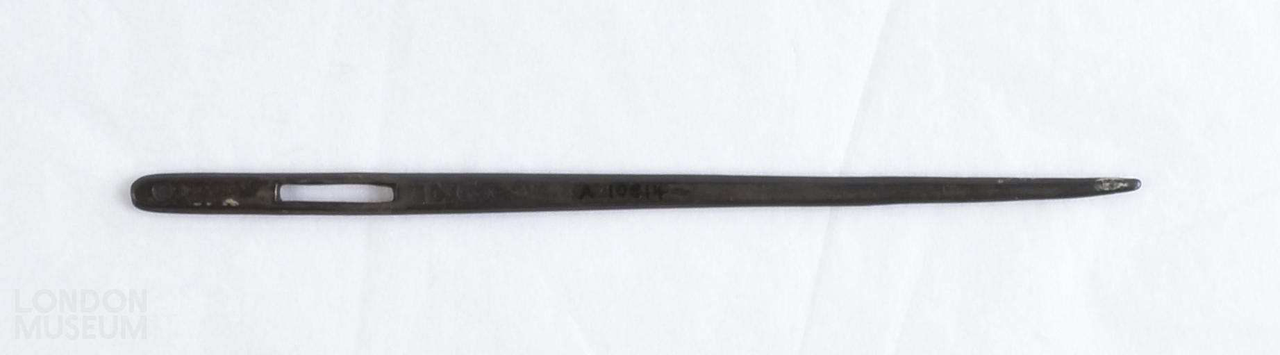 Metal bodkin. It is engraved with "E G" on one side, and is pierced with two holes at one end.