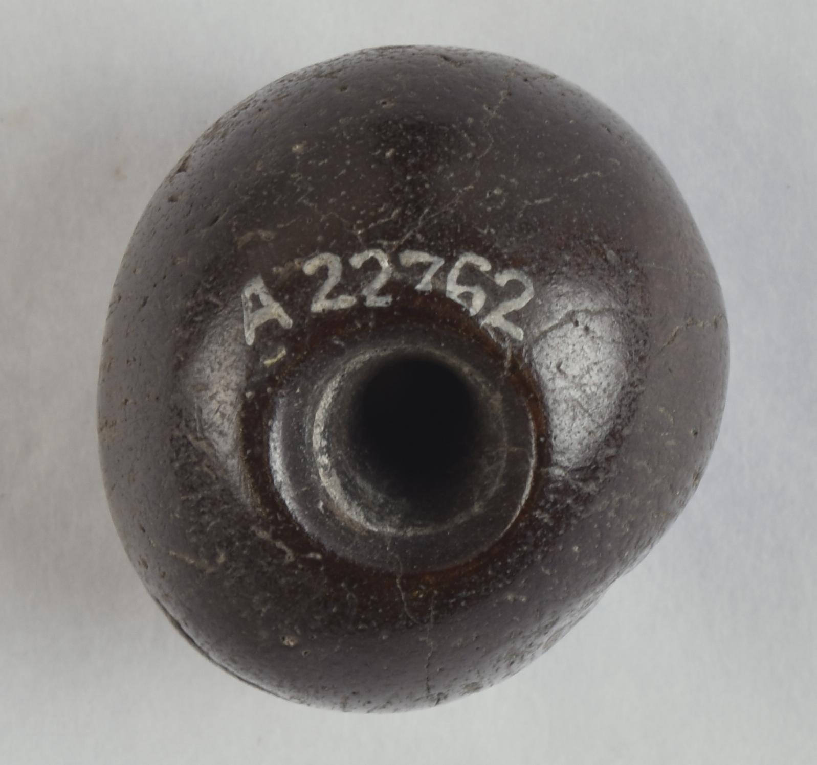 A bead made from antler, dark brown in colour, globular with a slightly funnel-shaped perforation.