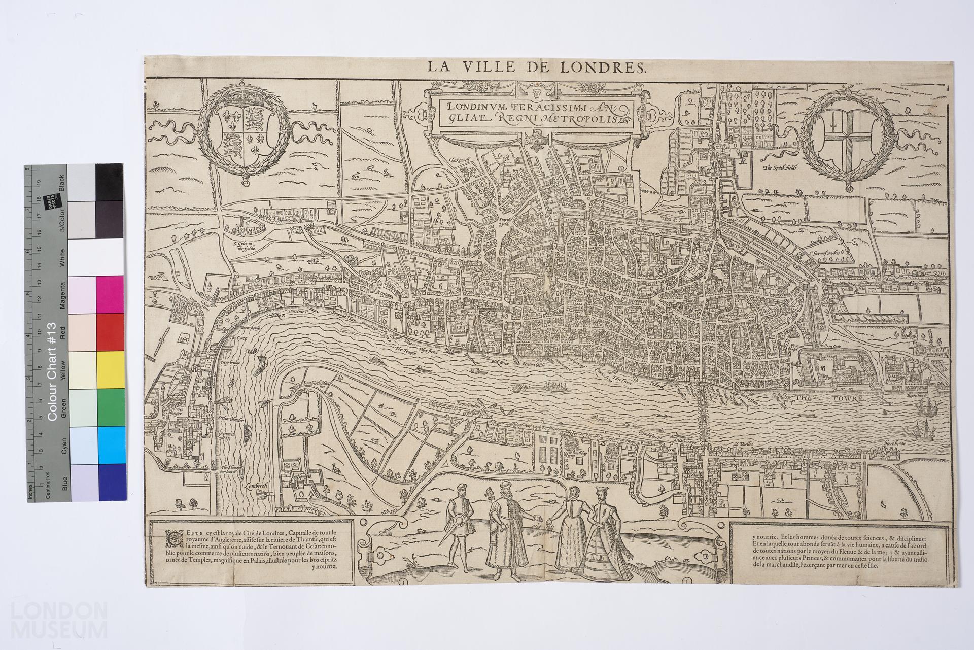 Map of London, 1575, Belle Forest. Titled: 'La ville de Londres, Londinum Feracissimi An.Gliae Regni Metropolis'. 2 captions with description of London and English society in French.