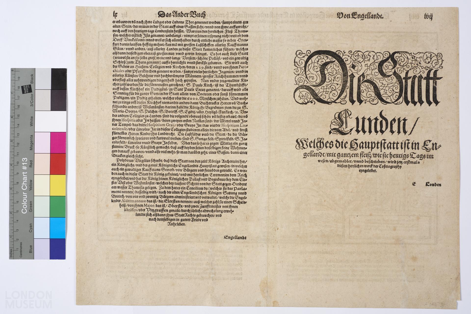 Map of London, titled "Londen oder Lunden die Hauptstatt in Engelland", German. From the Basle edition of Munster's Cosmographia, 1598. Copied from Hogenberg, 1572