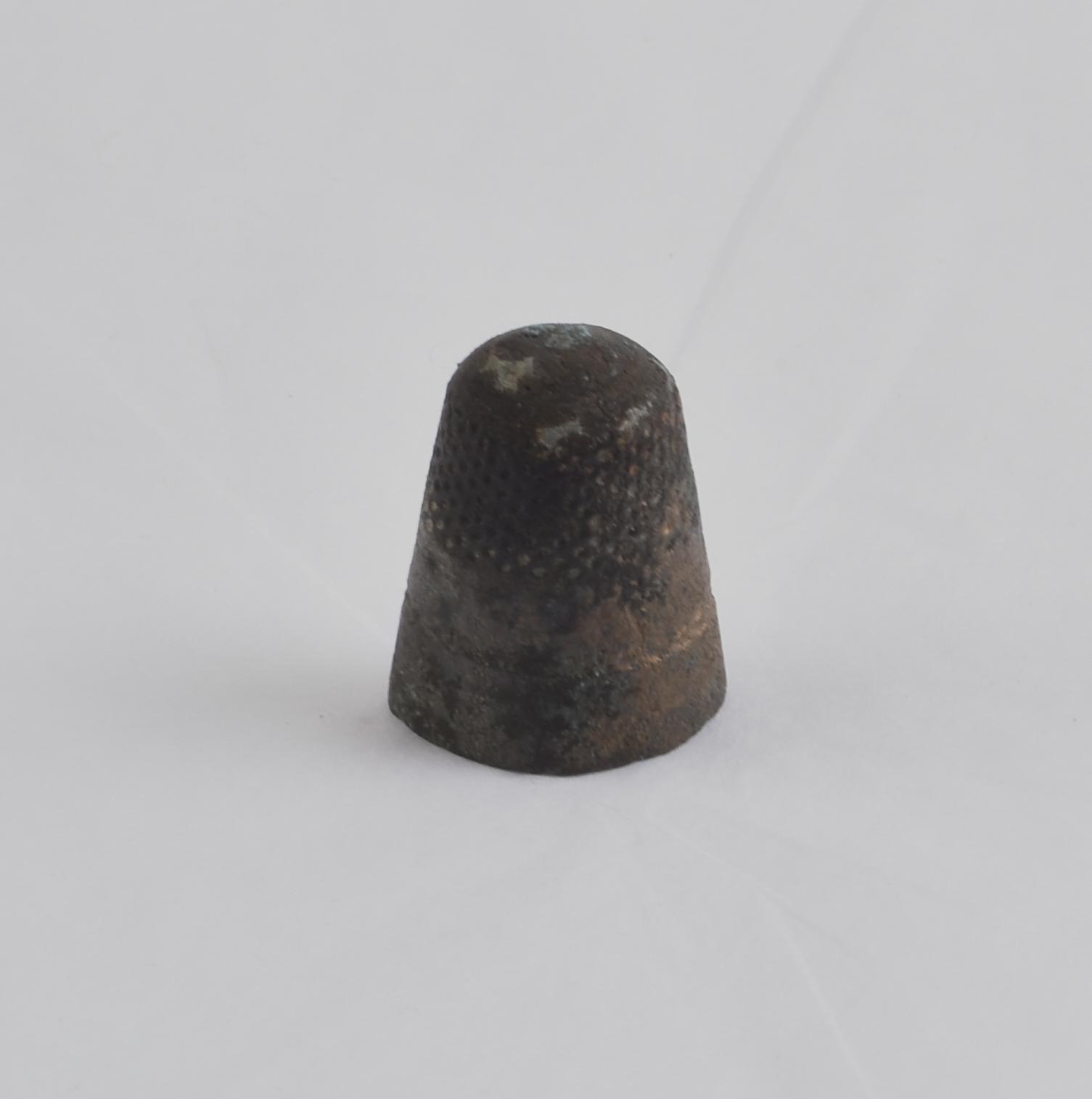 Thimble of copper alloy, indented. It is mis-shapen. Signs of oxidation.