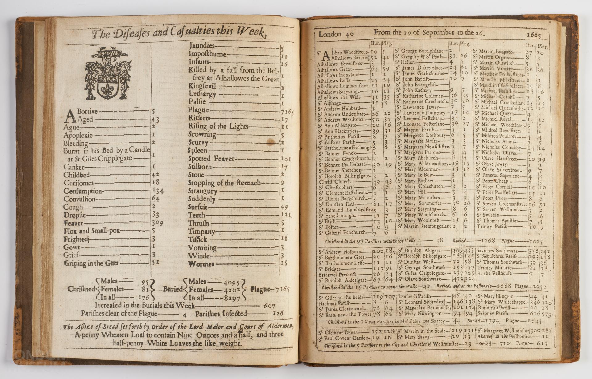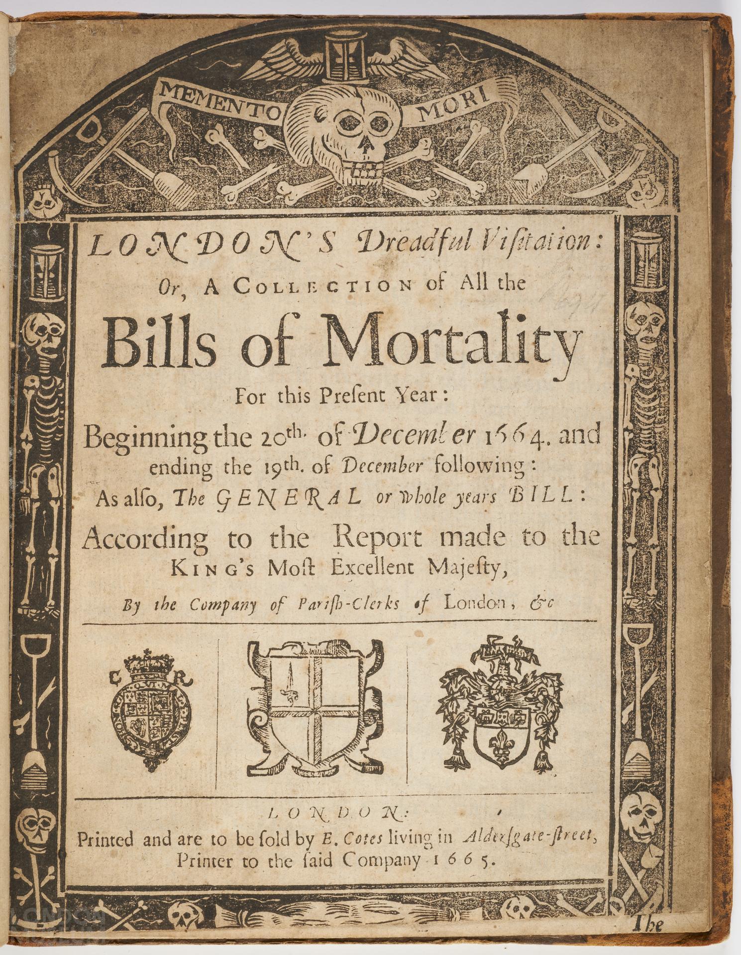Book: London's dreadful visitation: or, a collection of all the bills of mortality for this present year: beginning the 20th of December 1664 and ending the 19th of December following: as also, the general r whole years bill: according to the report made to the King's most excellent majesty. By the Company of Parish Clerks of London, etc. London: Printed and are to be sold by e. Cotes liveing in Aldersgate Street, printer to the said Company 1665.