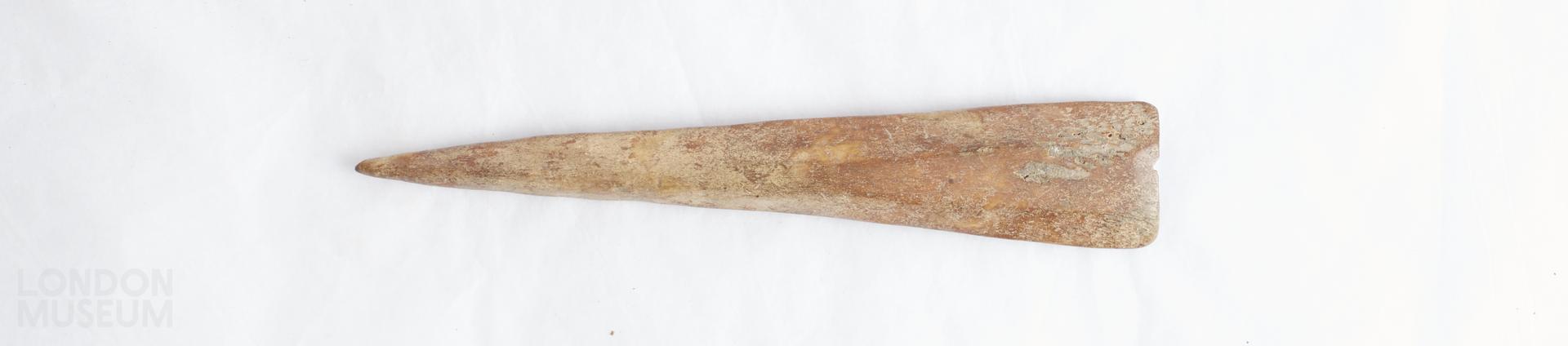 Implement made of bone. With gouge-like base (but not sharp). Tapers to a quadrilateral point. Smooth surface.