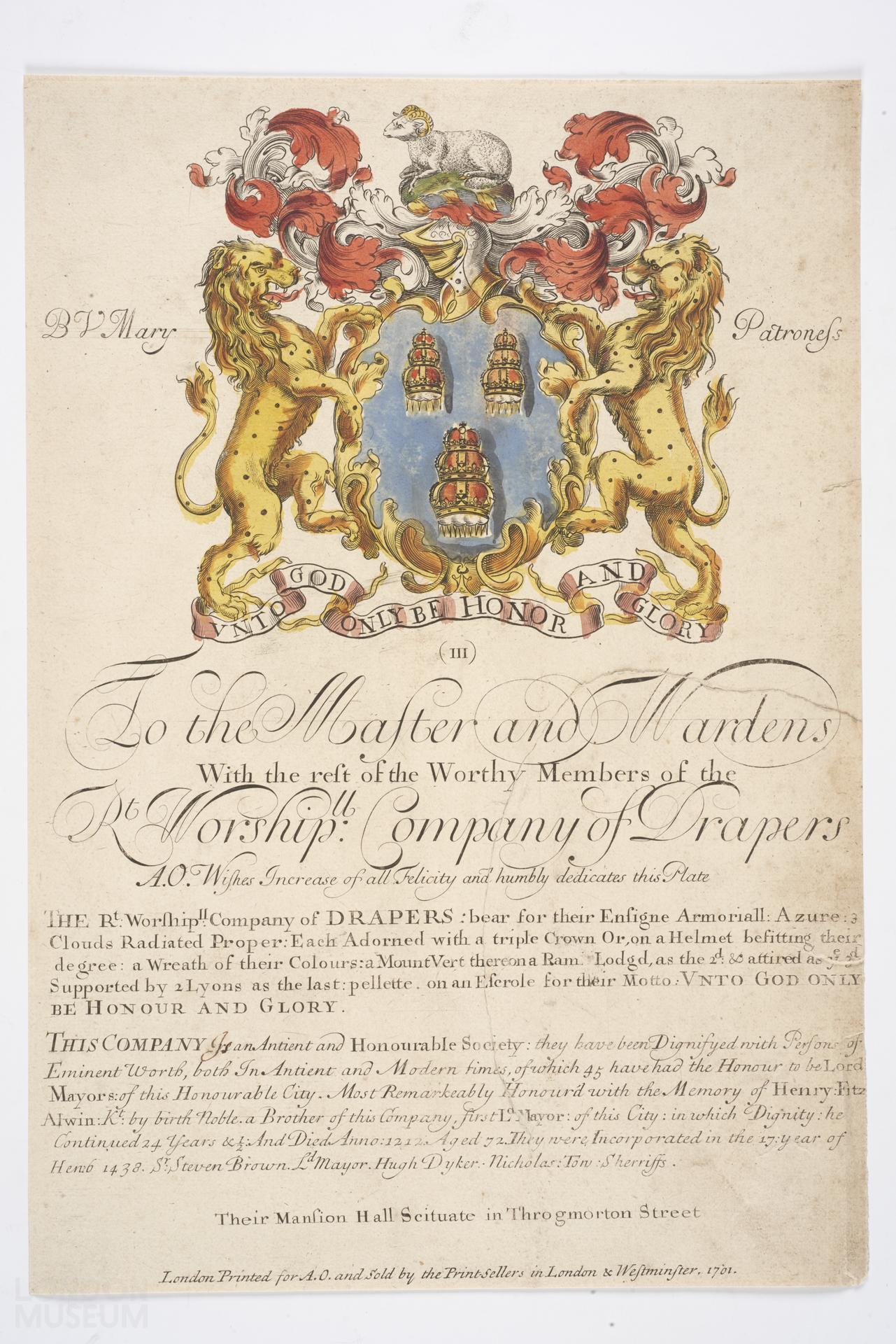 'To the Master and Wardens. . . of the Rt Worship'll Company of Drapers'. Arms of the Drapers Company with a description.