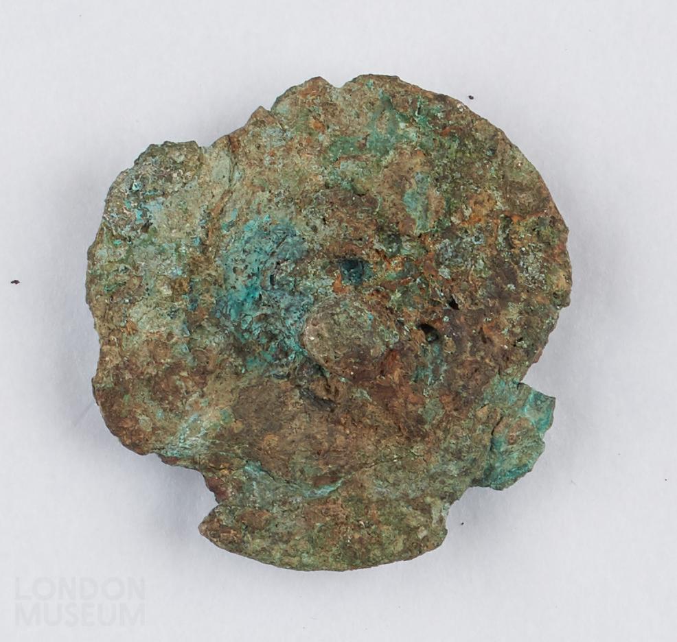 Bronze ornament, circular, much decayed. Remains of a stump in the centre with a circular rim on the reverse side.