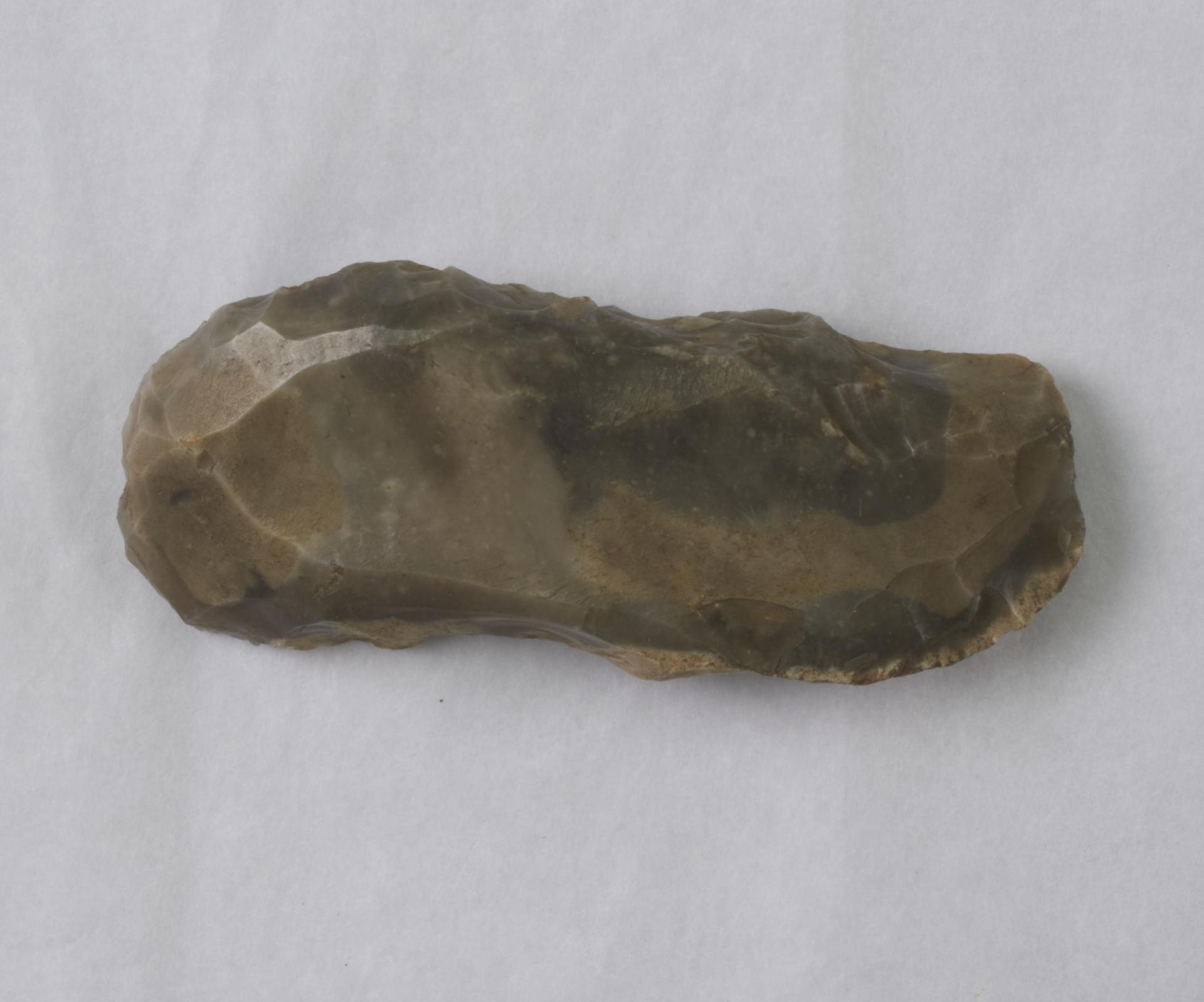 End scraper of mottled grey flint, made on a thick flake with small area of cortex remaining. One edge has steep retouch and evidence of utilisation.