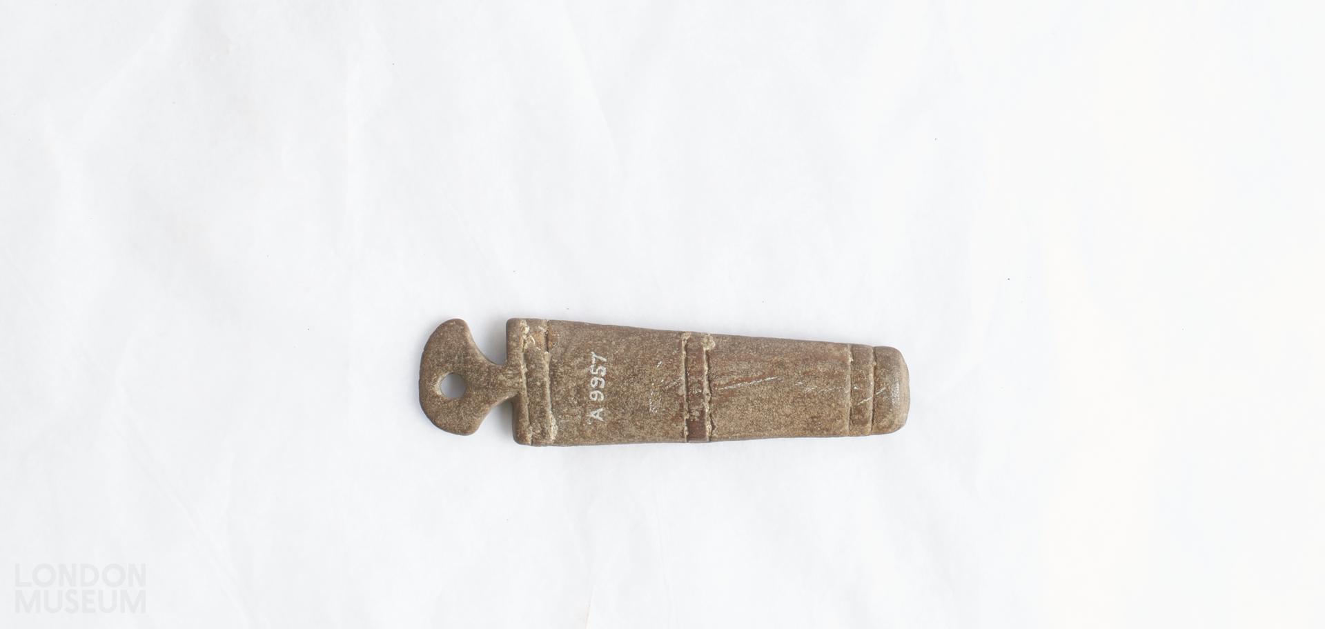 An amulet made of worked bone. Long flat body incised with 3 pairs of decorative straight lines, at top, middle and bottom. Slightly tapered. Widest end features carved circular protrusion with hole through middle.