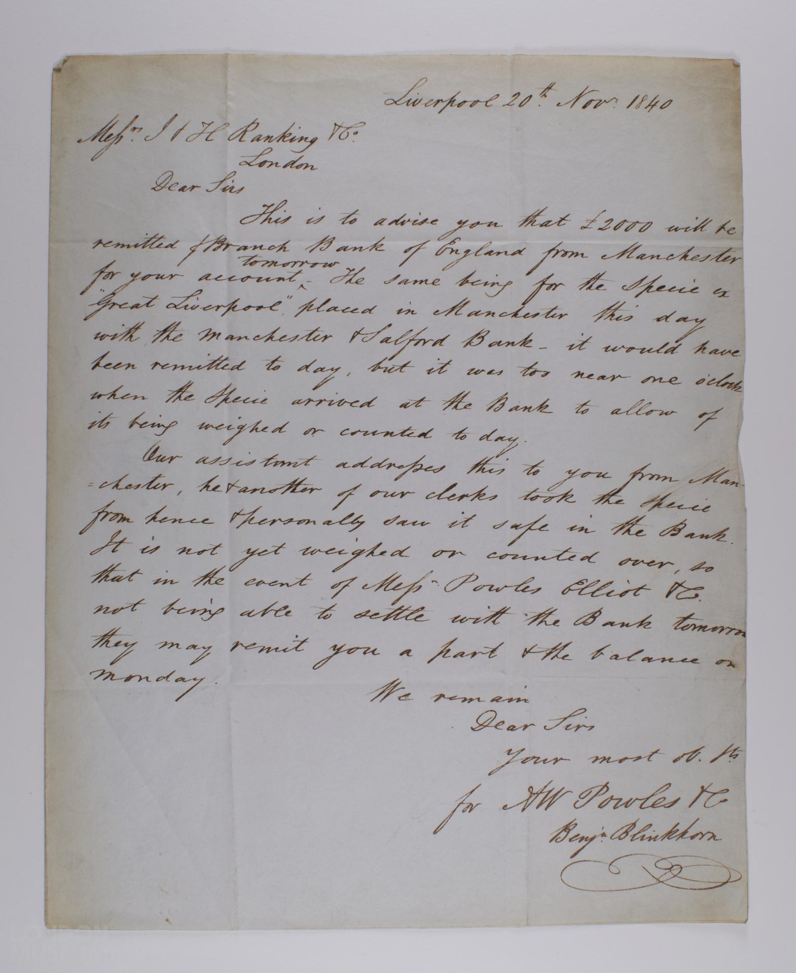 Letter referring to the payment of money into a bank account. Addressed to J & H Ranking & Co. Includes penny black stamp and postmark 21st November 1840.