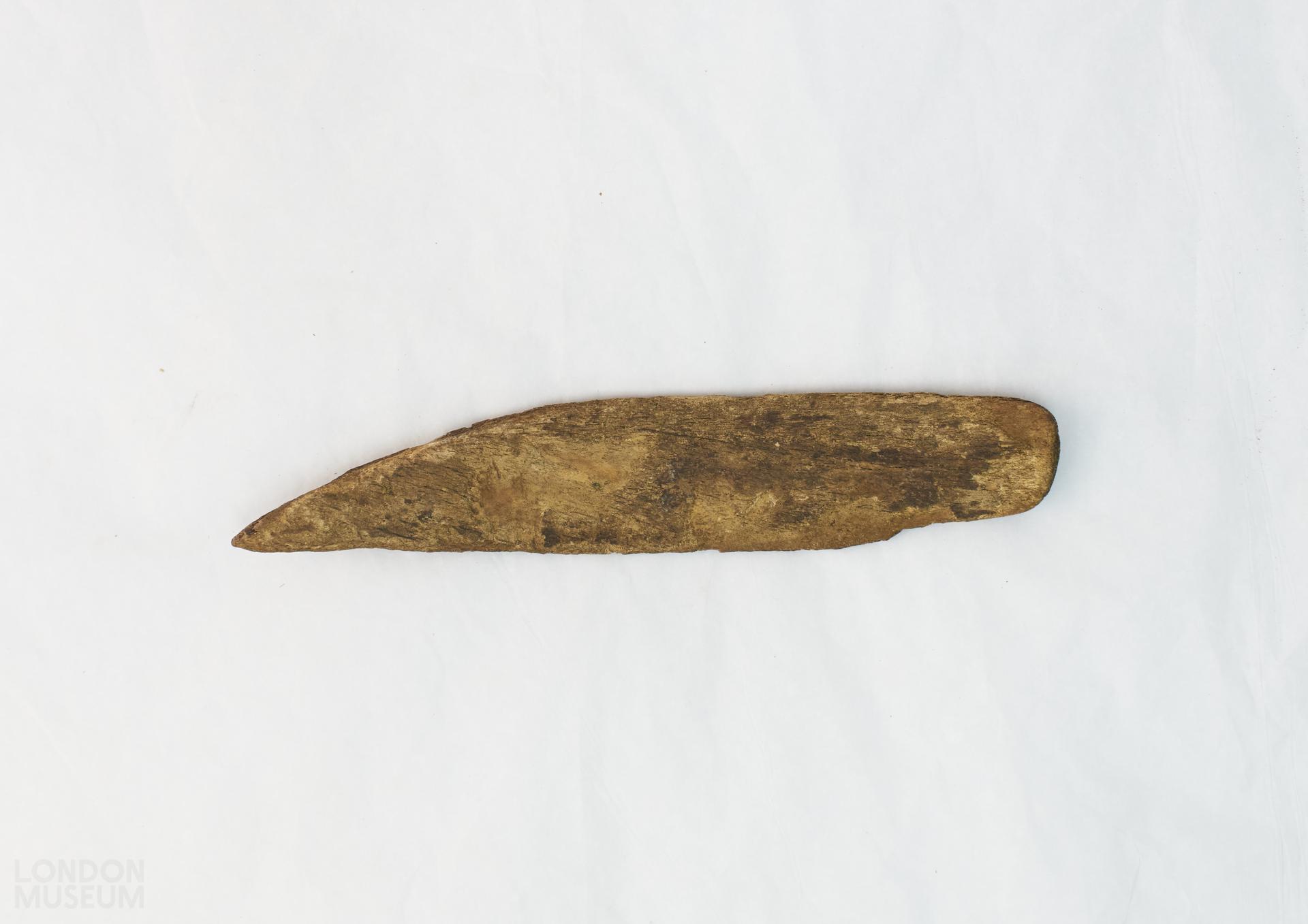 A knife made from the rib bone of an ox. Long, thin and flat in shape with one rounded end.