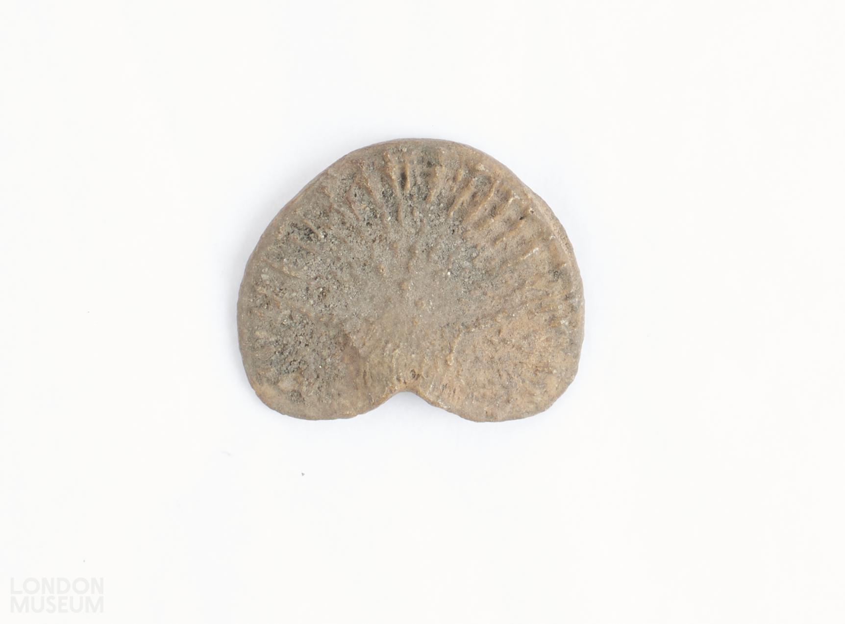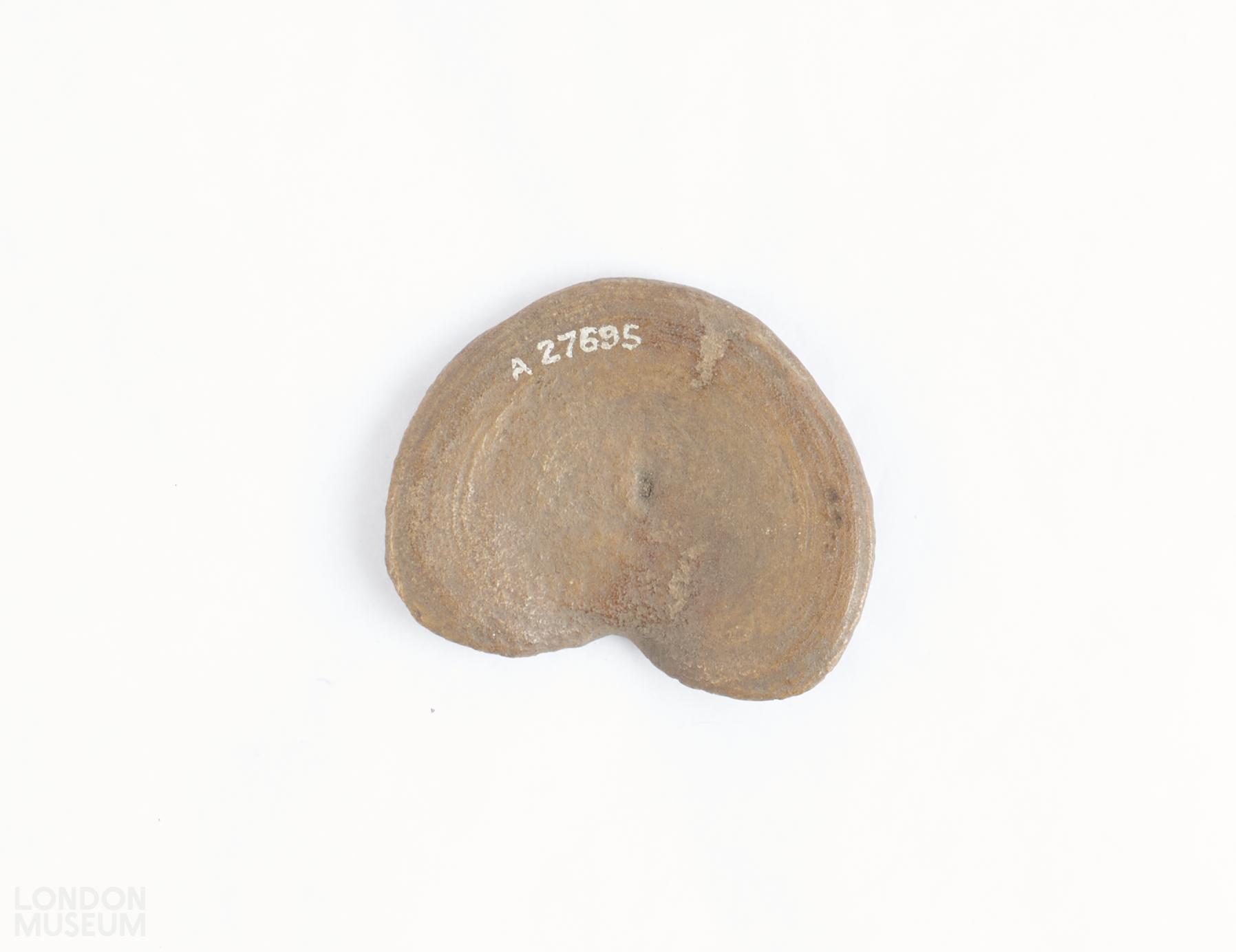 End of animal long bone, probably unfused. A rounded heart-like shape, smooth surface on top and rough ridged surface on reverse.
