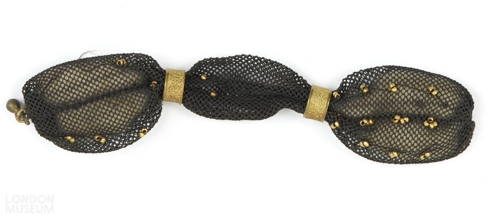 Miniature purse of black net, decorated with gilt beads and gilt rings either end.