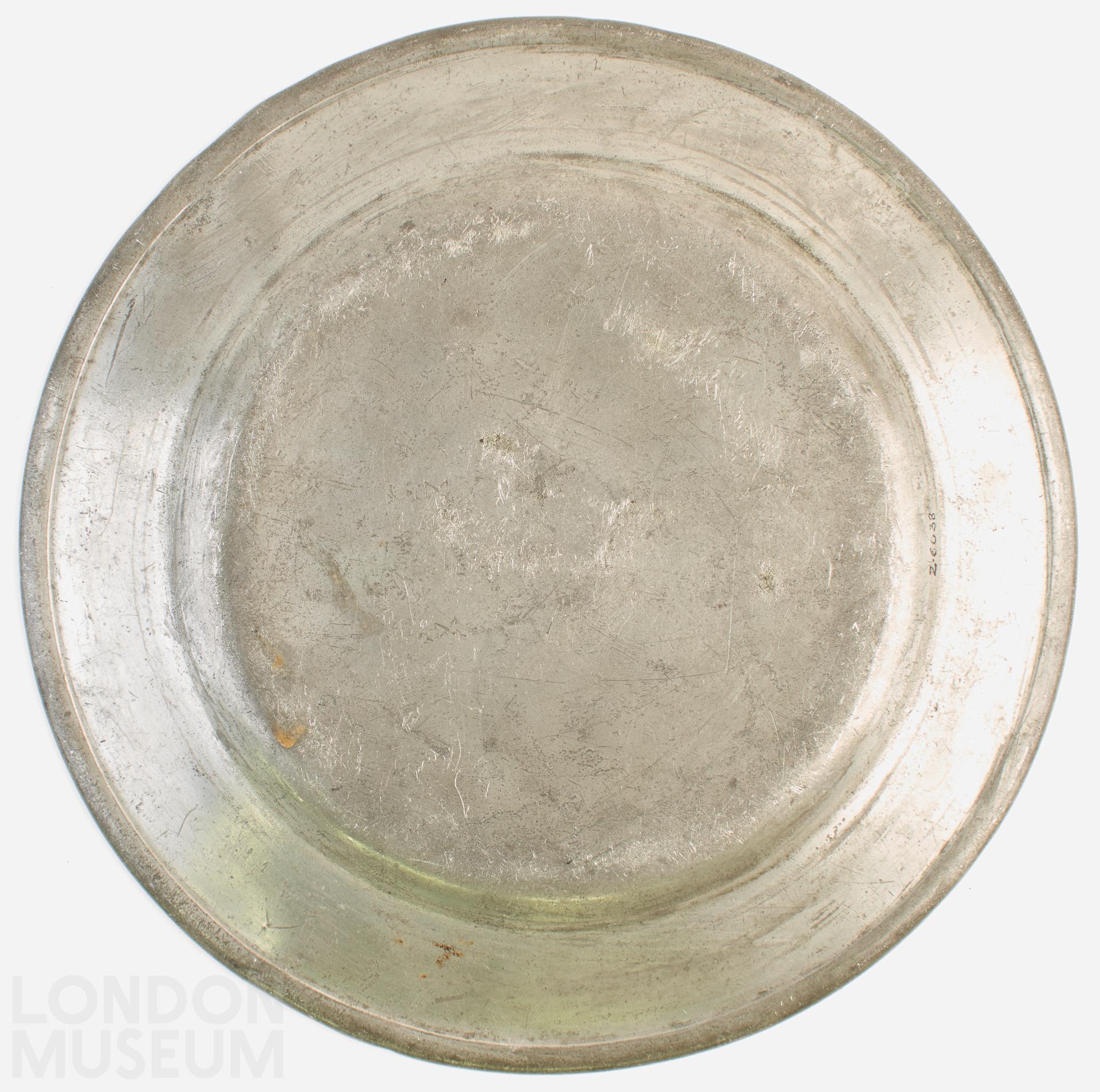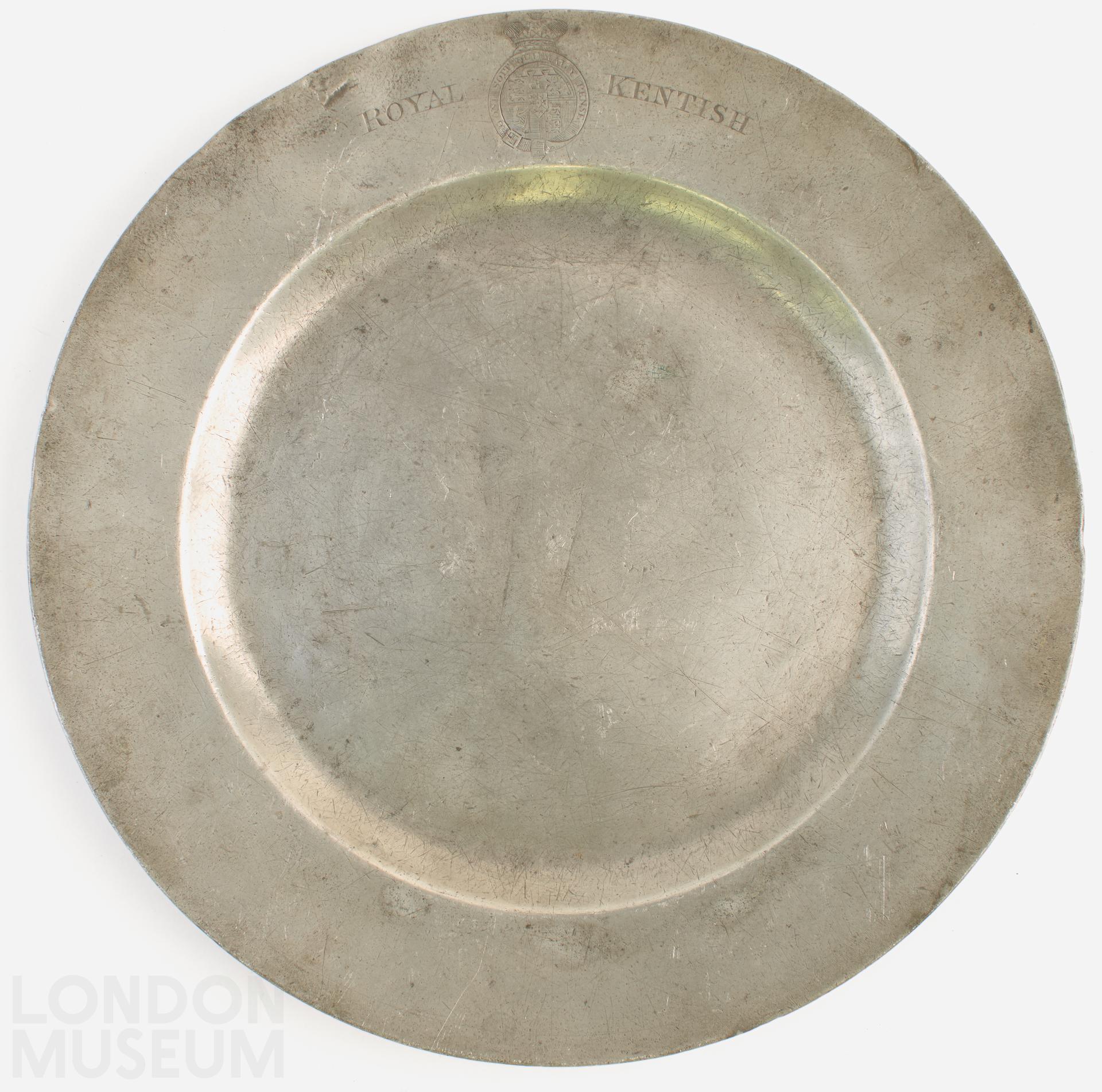 Pewter plate, the rim is engraved with the Crowned Garter and Royal Arms of Hanover of 1816-1837 (the arms of England in the first and fourth quarters, Scotland in the second and Ireland in the third, with the arms of Hanover placed on an escutcheon overall surmounted by a Royal Crown and a three-point label). The Royal Arms are flanked by the words ‘ROYAL’ and ‘KENTISH’. The centre of the plate has an engraved crest of a Boar’s head on a torse, and below are scratched inscriptions ‘W. LE. LISZT’ and ‘Ave Maria’ which were evidently added at a later date. There are faint touches underneath of two ‘Xs’; a ‘LONDON SUPERFINE’ label and the very indistinct mark of Thomas Alderson, London, OP40 of 16 Great Marlborough Street and Thames Bank, Chelsea. Alderson was active from c.1796-1825 and was Pewterer to King George IV.The Royal Kentish Bowmen formed in 1785, was a socially prestigious archery club, from 1789 under the patronage of George, Prince of Wales. The club met on Dartford Heath and in addition to archery competitions they had premises where dinners were held; the organisation did not survive the Napoleonic Wars. The three-point label in the Royal Arms indicates that the Arms are those of the Prince of Wales. See C.R. Humphery-Smith, ‘The Royal Heraldry of England’, in The Coat of Arms, vi (1960-61) and vii (1962-63). Alderson made most of the pewter for the Coronation Banquet of George IV in 1821 (see Tom Pickett ‘The Coronation banquet of George IV’ in JPS, Spring 2008, pp 36-40.