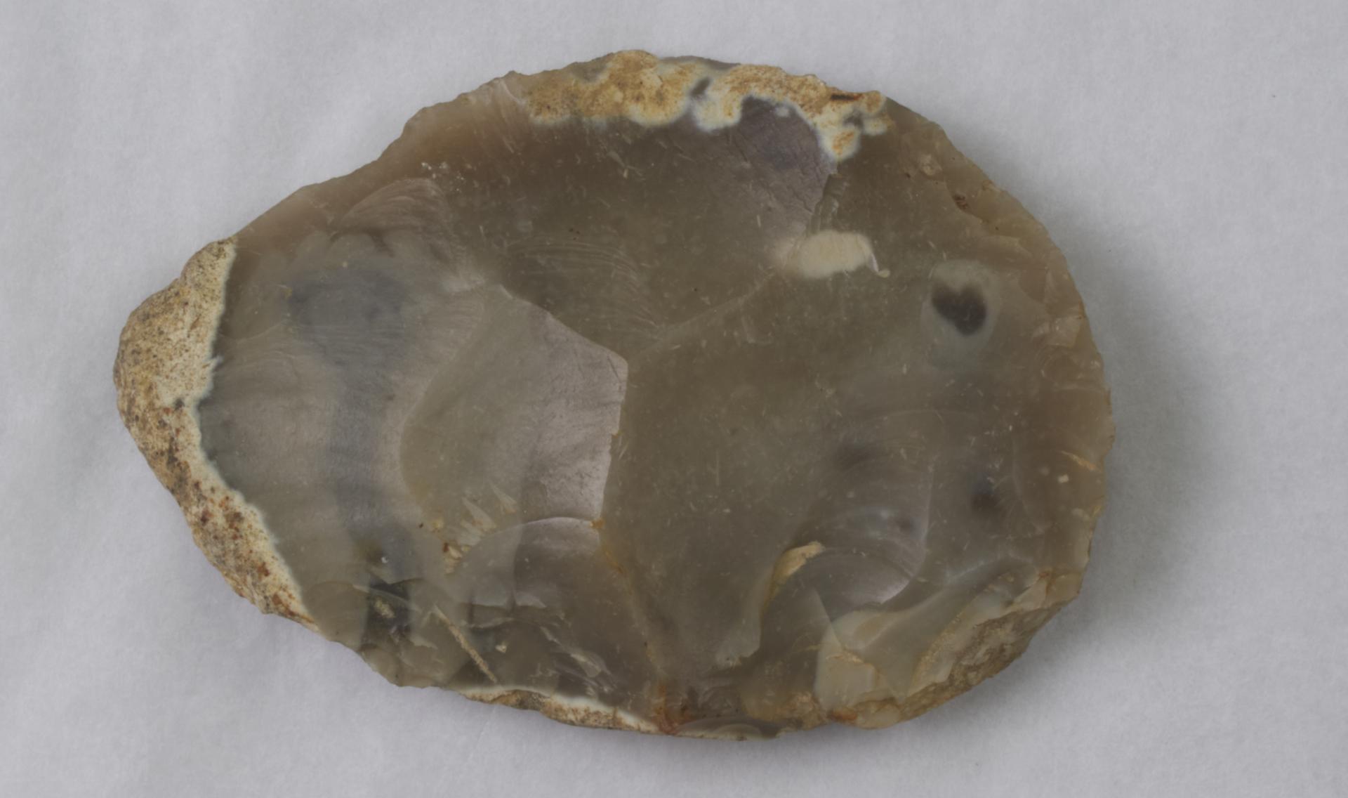 Irregular shaped scraper of light grey flint made on a flat flake, with slight retouch on one edge. Small area of cortex remaining.