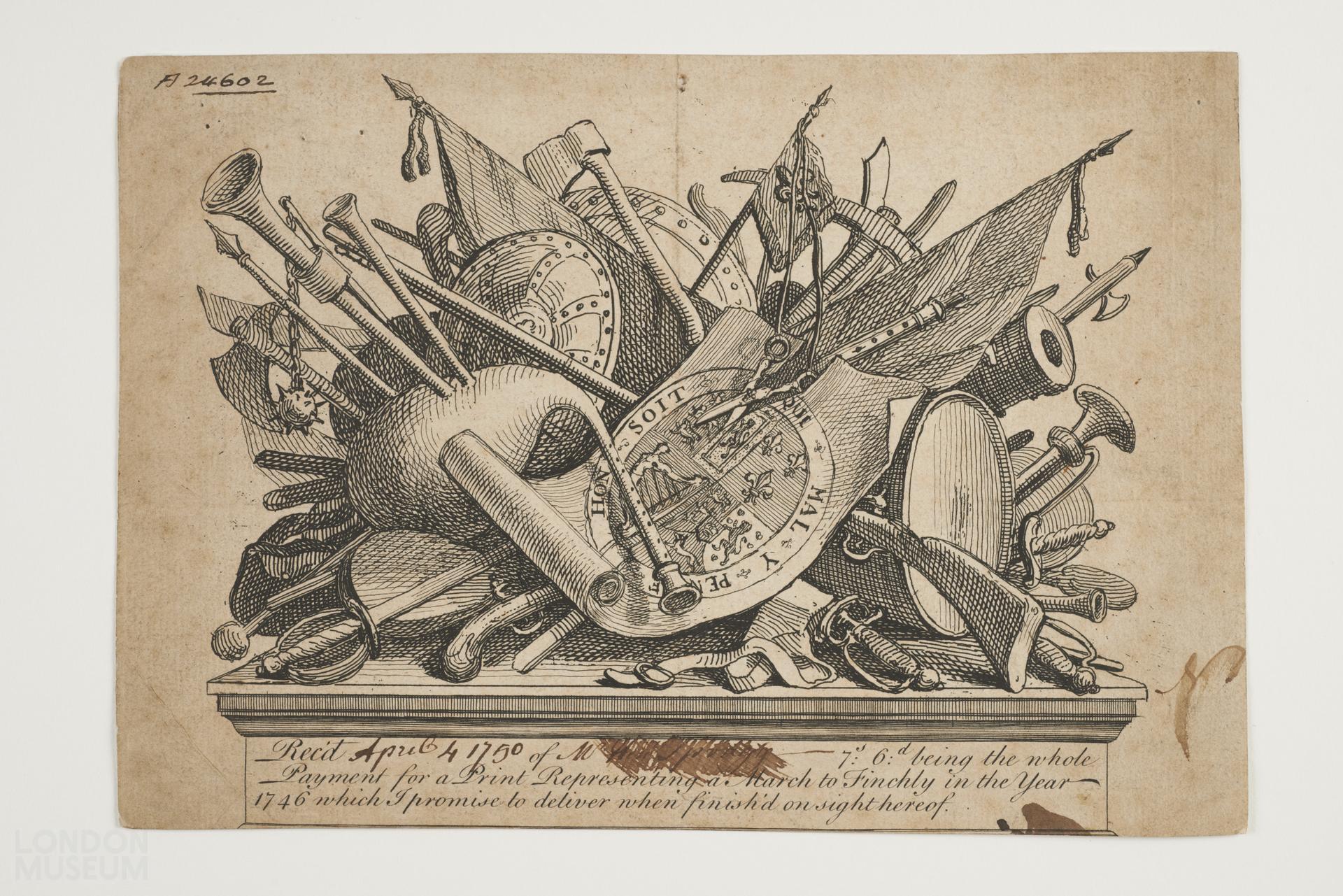 The subscription and lottery ticket for 'A March to Finchley' by Hogarth. The receipt is inscribed 'Rec'd April 4 1750 of Mr Henry Spragg (inked over) 7s, 6d being the whole payment for a Print Representing a March to Finchly in the year 1746 which I promise to deliver when finish'd on sight hereof.' Lower section of the print has been cut. The ticket shows swords, musket, trumpet, drum and kettledrum, fife, canon, halberd, pickaxe, scimitar, lance with pennon, pistol, broadsword, haversack, Lochaber axe, morning star, Highland target, bagpipe, shield and 2 flags -all objects used in war. On the left, those appropriate to the Scots, those on the right are British weapons. The scroll in front shows the arms of Great Britain and Scotland, with a pair of scissors cutting out the lion rampant of Scotland.
