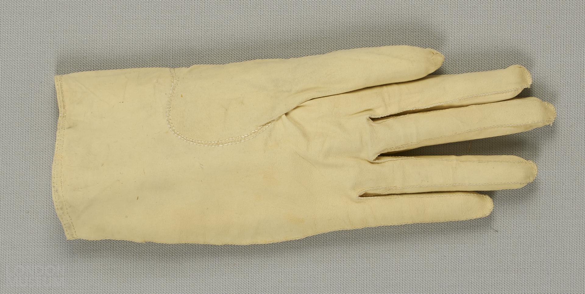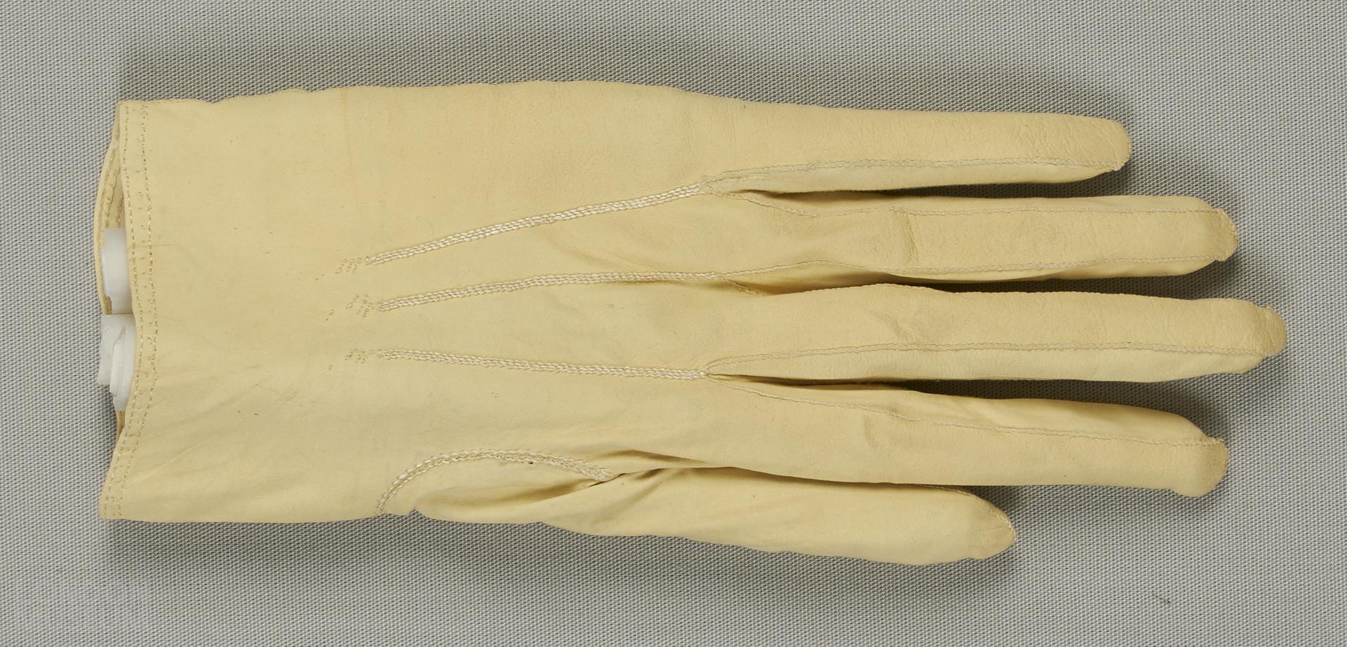 Register entry reads: Gloves (three) made of chicken skin. Given by Miss Blackett.