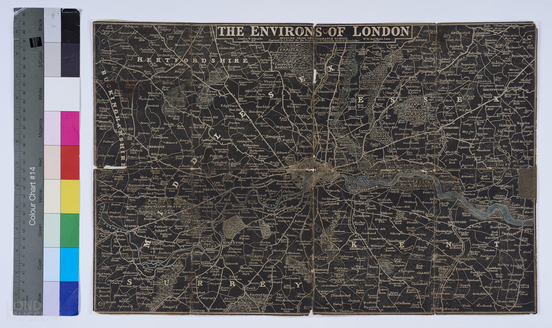 A map of London, titled ‘The Environs of London’, published on 6th April, 1833 by W. Edwards located at No. 12, Ave Maria Lane. Engraved by J. Archer (Joshua Archer) for the the proprietors of Pinnock's guide to knowledge and reduced from The Ordnance Survey. Extent: Epping, Tilbury, Leatherhead and Slough. River Thames highlighted in blue and River Lea highlighted in green. Information from previous Content description: ‘Appears to be Darlington and Howgego, 'Printed Maps of London c. 1553-1850', No. 359 but date does not match’.