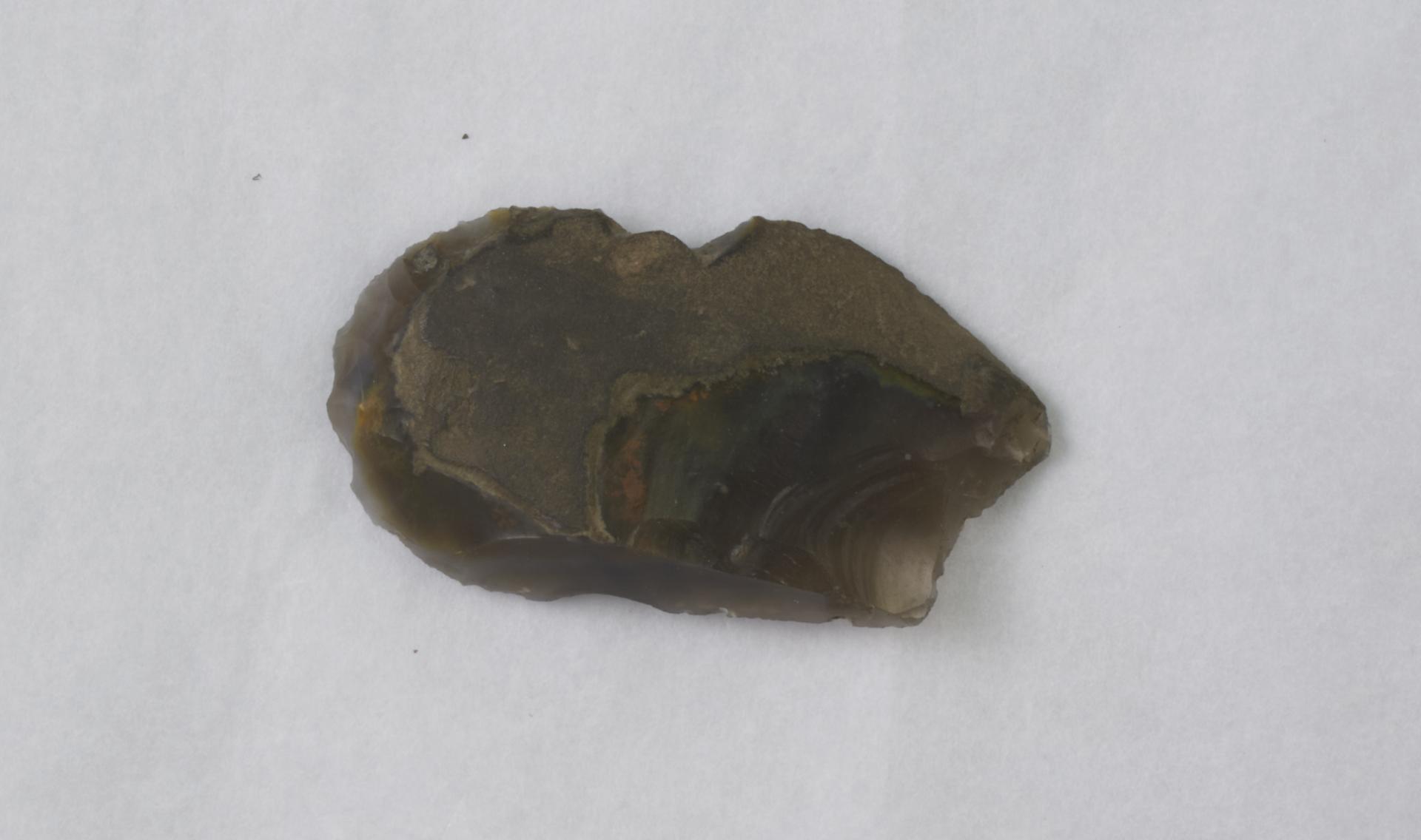 Scraper of mottled grey flint with cortex on dorsal face. Elongated shape. Striking platform snapped off.
