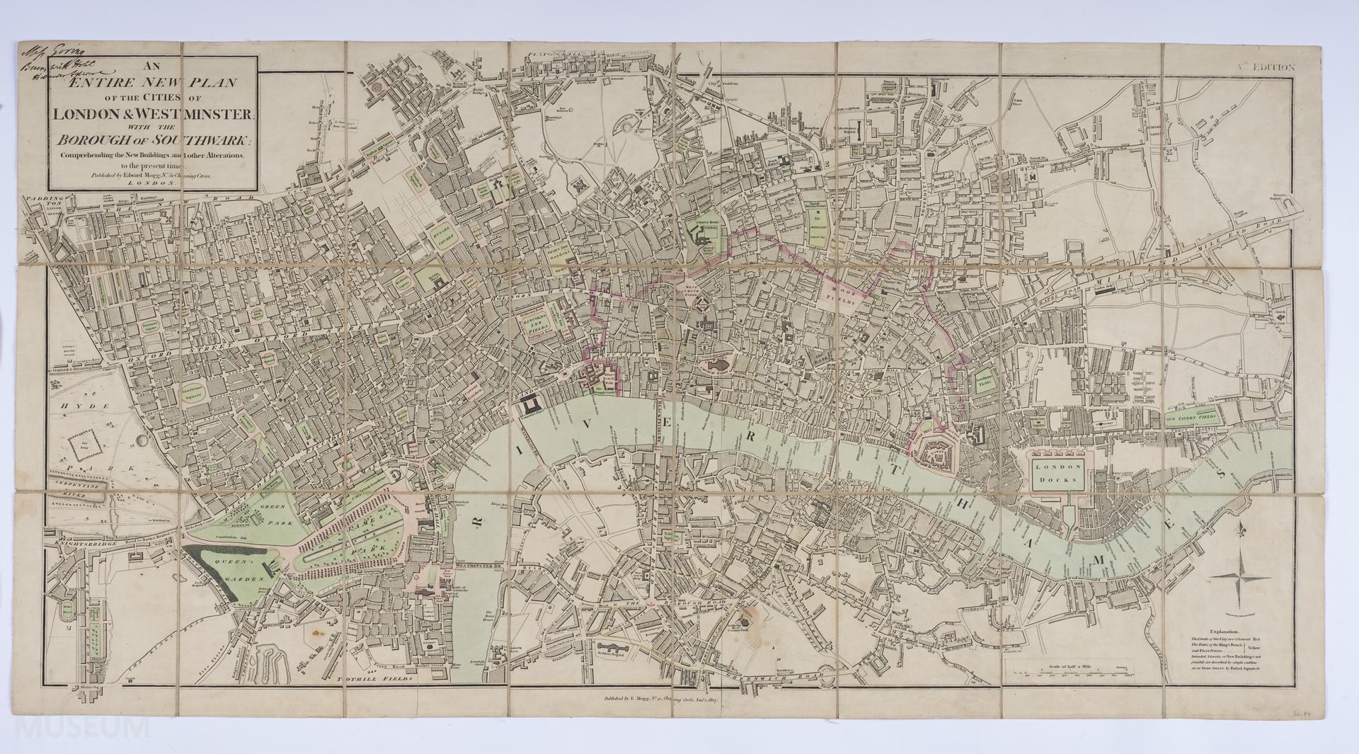 Plan of London, published by Edward Mogg, 1817 (sold by Fearman, 170 New Bond Street). Thirteenth edition (1st edition 1803?). Folding map, with some colour, mounted on linen. Title: 'AN ENTIRE NEW PLAN OF THE CITIES OF LONDON & WESTMINSTER; WITH THE BOROUGH OF SOUTHWARK: Comprehending the New Buildings and other Alterations to the present time'. Extent: Pentonville, Mile End, Lambeth and Paddington. See also 50.64 and A13019.