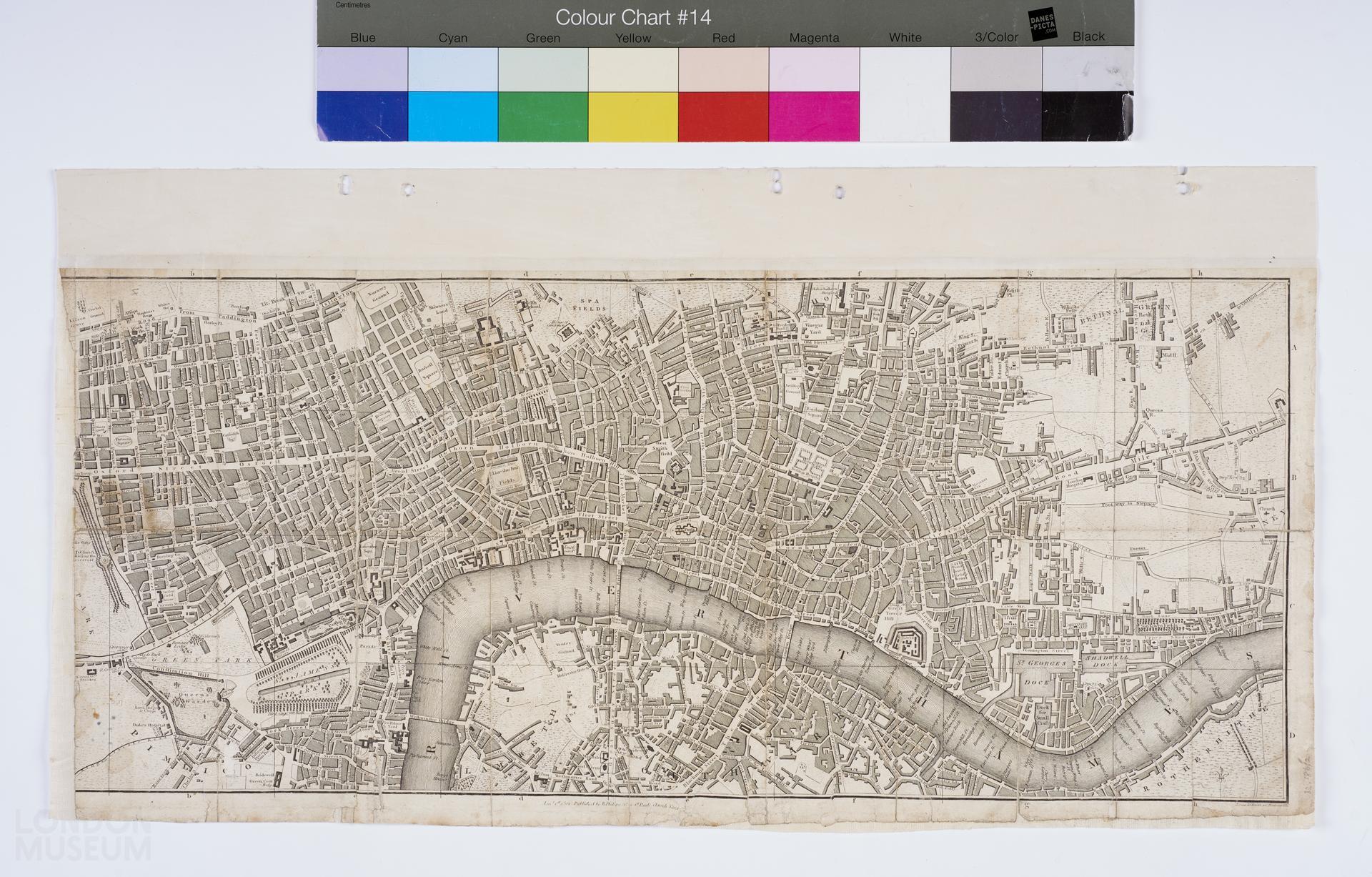 A plan of London published on 1st January, 1802 by R. Philips located at No. 1, St. Pauls Church Yard. No title. The plan illustrates the City of London, east to Mile End, south to Southwark, west to Oxford Street and north to Spa Fields. Notes printed at bottom right corner reads, ‘Jones & Smith sc. Pentonville’.