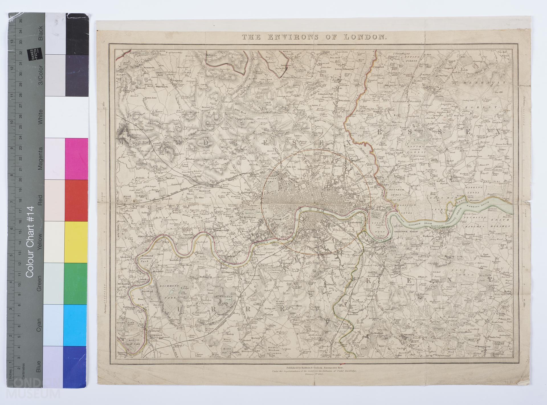 A map titled ‘The Environs of London’, published by Baldwin & Cradock for the society for the Diffusion of Useful Knowledge on 1st February, 1832. The map shows London and the surrounding countryside. Extent: Southgate, Erith, Mitcham and Hanwell. The limit of the City of London, River Thames, River Lea and other area highlighted in different colours. Information from previous Content description: See 53.52/1, which is almost identical apart from the inclusion of 'Drawn & Engraved by H. Waters'.