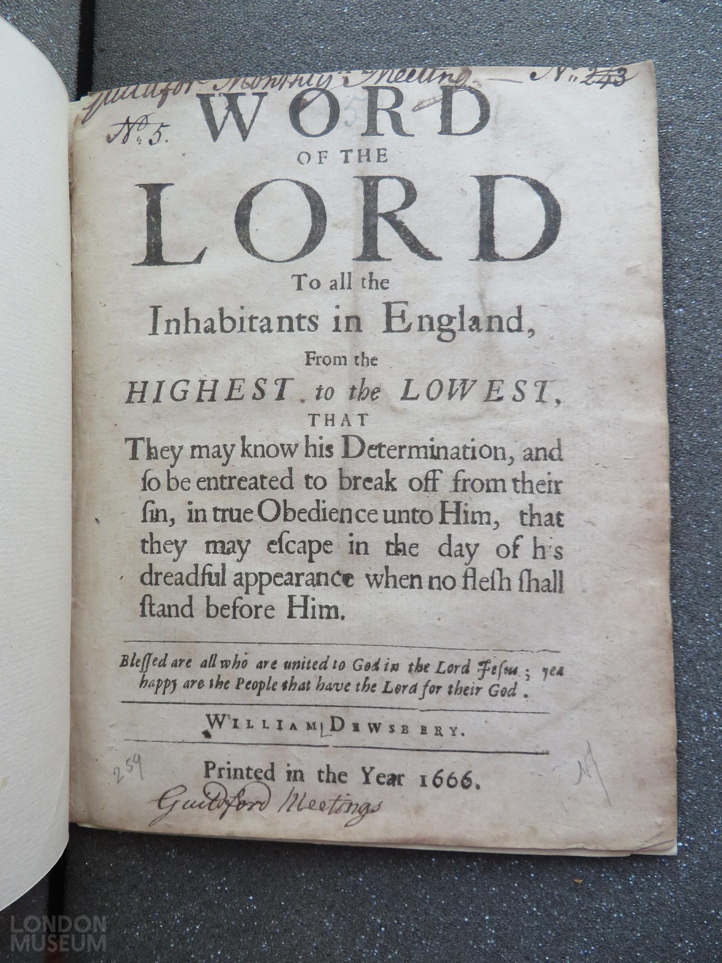 Pamphlet: The word of the lord to all the inhabitants in England from the highest to the lowest, that they may know his determination, and so be entreated to break of from their sin, in true obedience unto Him, that they may escape in the day of his dreadful appearance when no flesh shall stand before Him / William Dewsbery [sic]. Quaker tract with references to the plague. 1666. Title page includes inscription: Guildford Meetings, and Guildford Monthly Meeting N. 5 N. 243 (crossed).