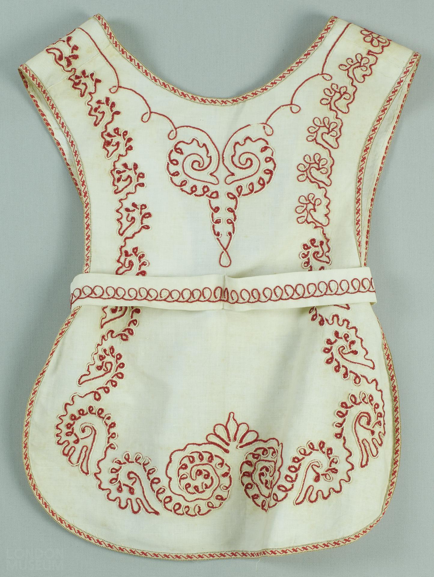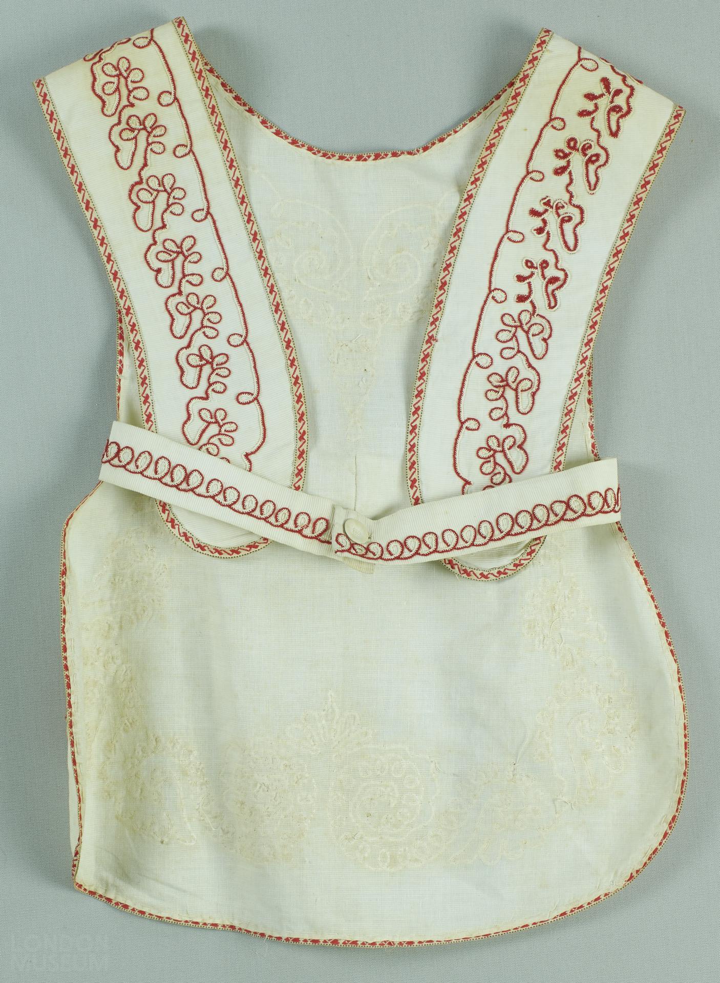 White pique cotton pinafore with red and wool crochet embroidery decorating the front and lappets, 1870. Edged with red, white and green braid. White cotton belt secured by a covered button at the back and secured with stiched at front centre. Belt decorated with embroidered loops of red and white wool. Each shoulder tipper [?] / lappet drapes over shoulder.