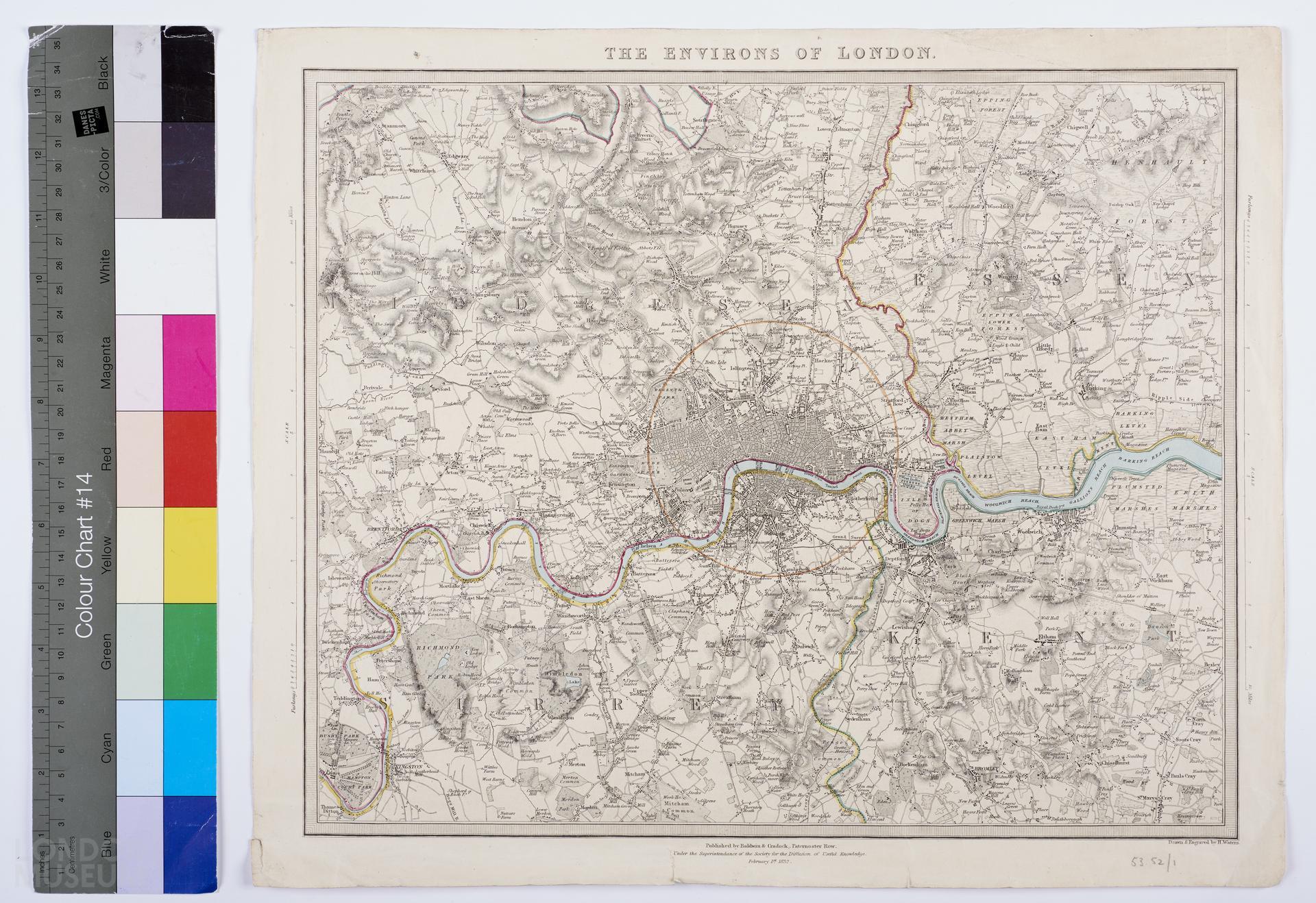 Map showing London and the surrounding countryside, published by Baldwin & Cradock for the society for the Diffusion of Useful Knowledge, February 1832. Some colour. Folding map, mounted on linen. First edition. Title: 'THE ENVIRONS OF LONDON'. Extent: Southgate, Erith, Mitcham and Hanwell. See 37.81/4, which is almost identical apart from the exclusion of 'Drawn & Engraved by H. Waters'.