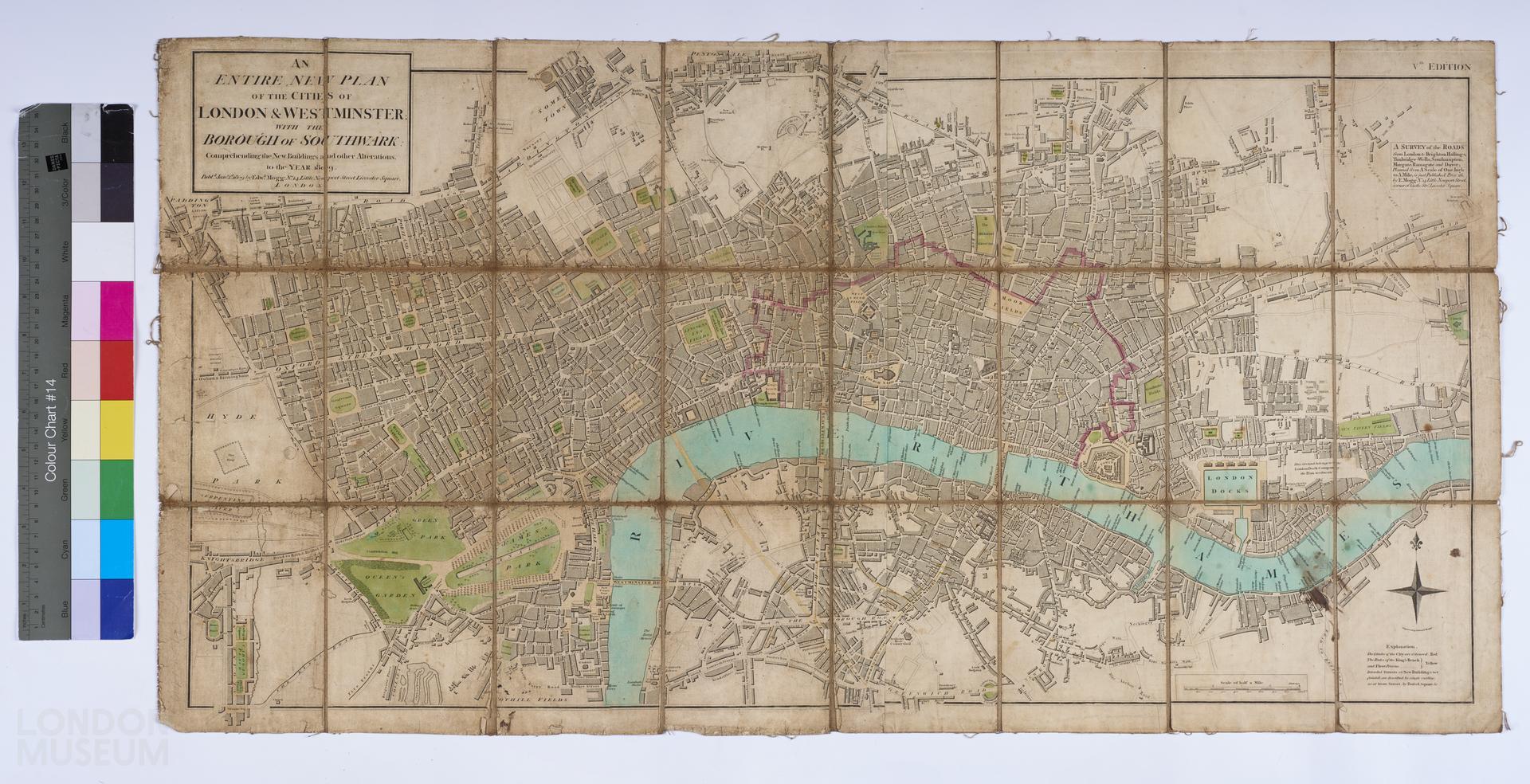 Plan of London by Edward Mogg, 1809. Seventh edition (1st edition 1803?), all editions after and including this one are stated to be the 5th edition). Folding map, in colour, mounted on linen. Title: 'AN ENTIRE NEW PLAN OF THE CITIES OF LONDON & WESTMINSTER; WITH THE BOROUGH OF SOUTHWARK: Comprehending the New Buildings and other Alterations to the year 1809'. Extent: Pentonville, Mile End, Lambeth and Paddington. See also 30.80 and A13019.