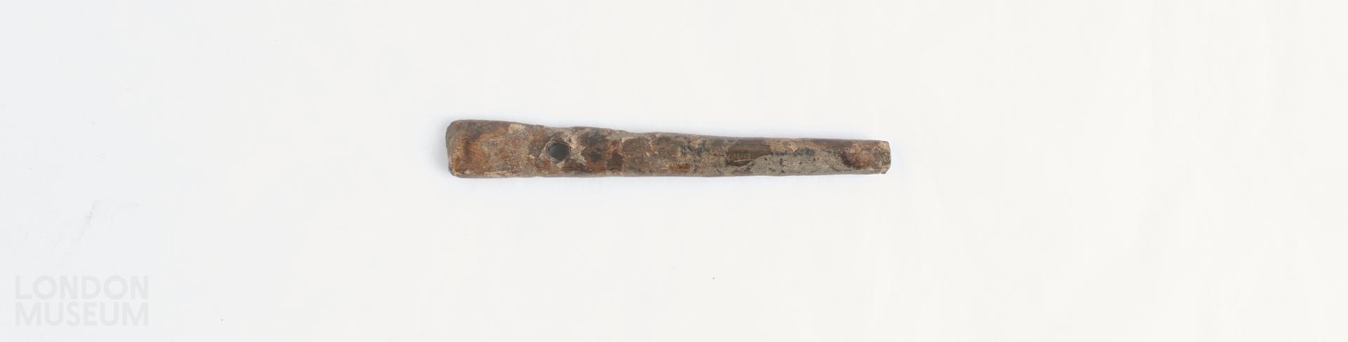 Carved bone needle, carved hole at one end. Clean break at other end where pointed end would have been.