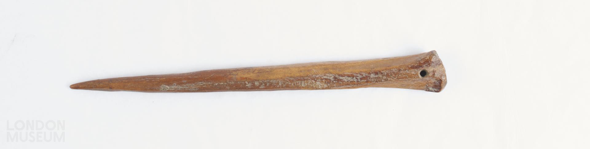 Carved bone needle, carved hole at one end and sharpened to a point at the other. One side is flat.