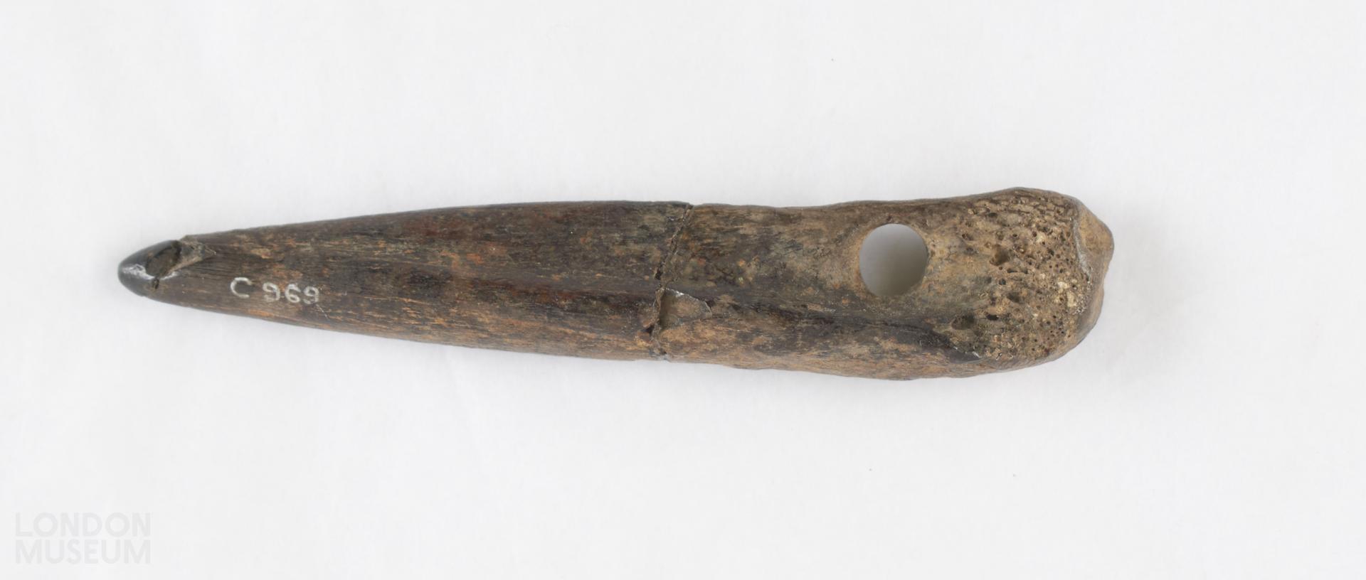 Pin or needle(?). Inscribed in white ink 'Thames Alluvium Wandsworth F. Corner. Coll'.