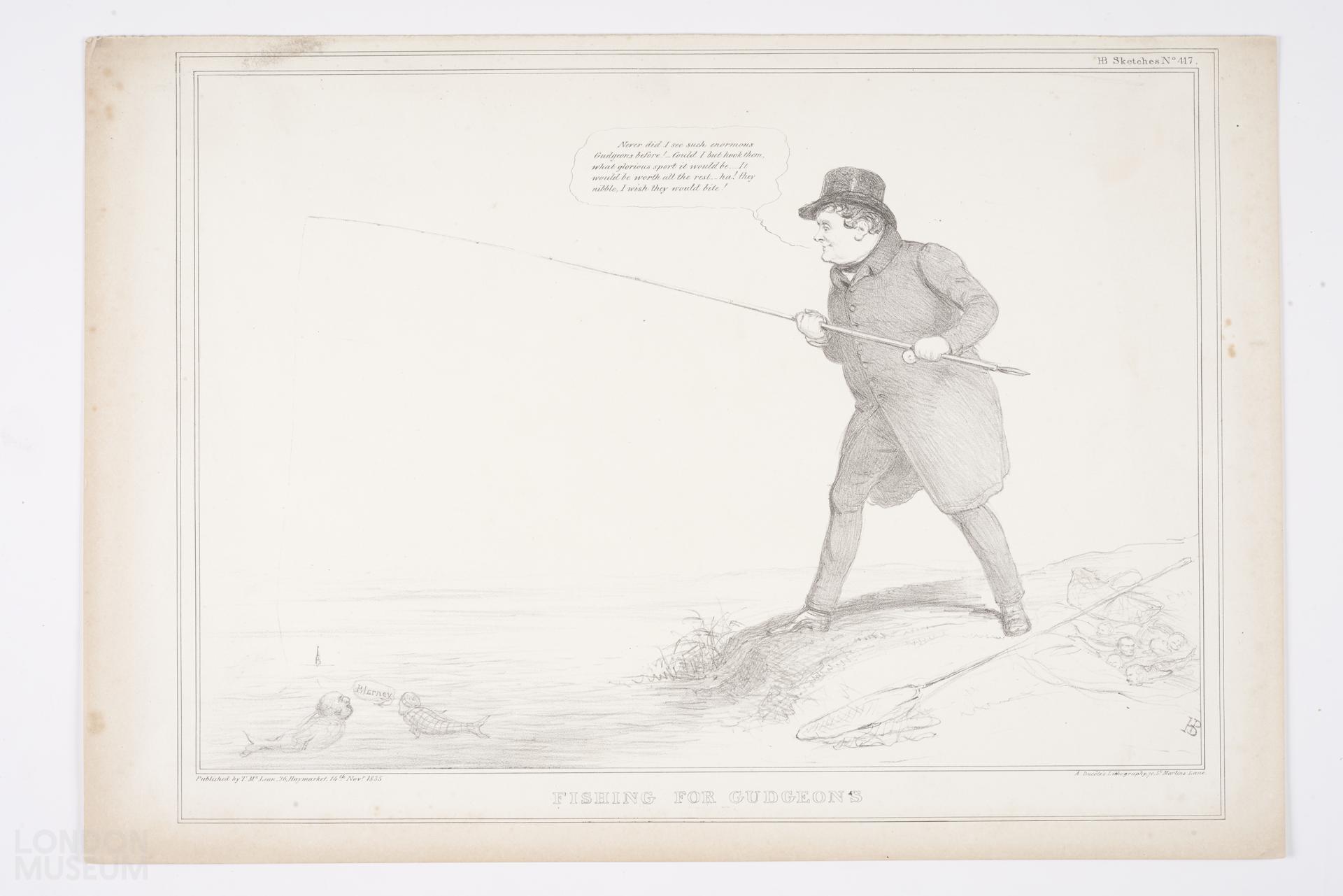 Fishing for Gudgeons. One in a series of political caricatures by HB, various dates between 1835 and 1839. An angler (unidentified) fishes for two [Irish] 'fish'. Labelled 'HB Sketches No. 417'.