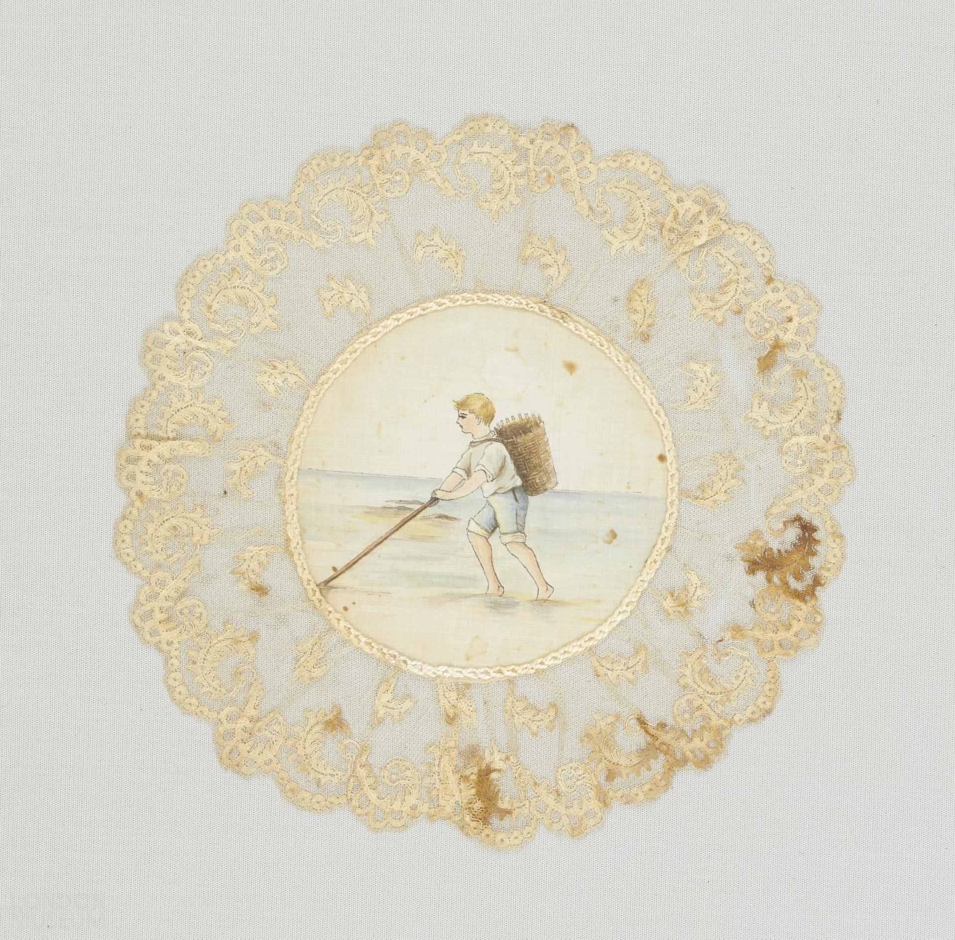 One of a set of linen circlular table mats, with a lace scallop detailed border. Hand painted illustration of a child wearing carrying a basket on their back, next to the sea. Condition: a few stains.