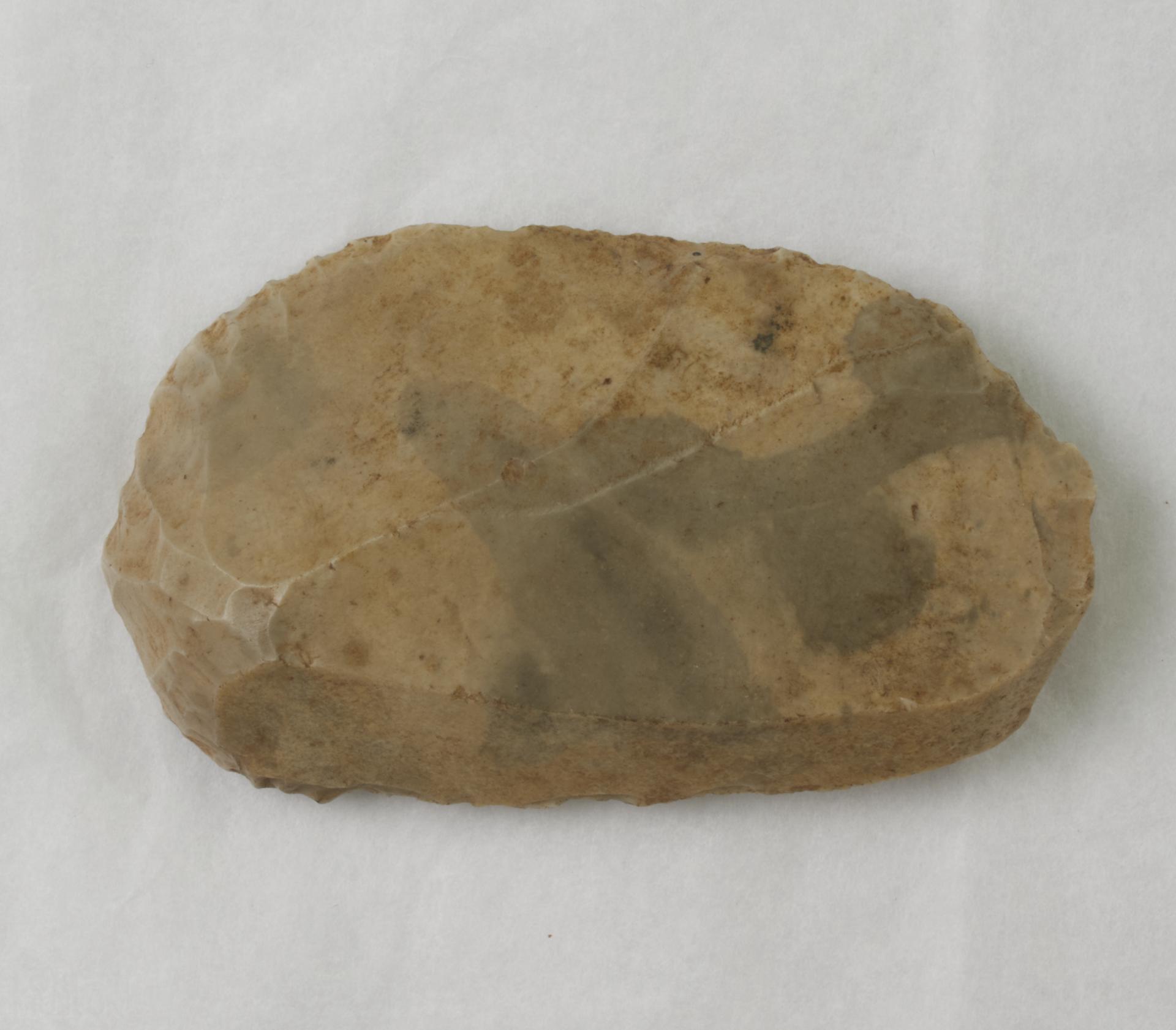 Flint scraper with pressure flaking scars at the scraping edge. Roughly oval in shape. Possibly a side scraper, one long edge has been retouched.