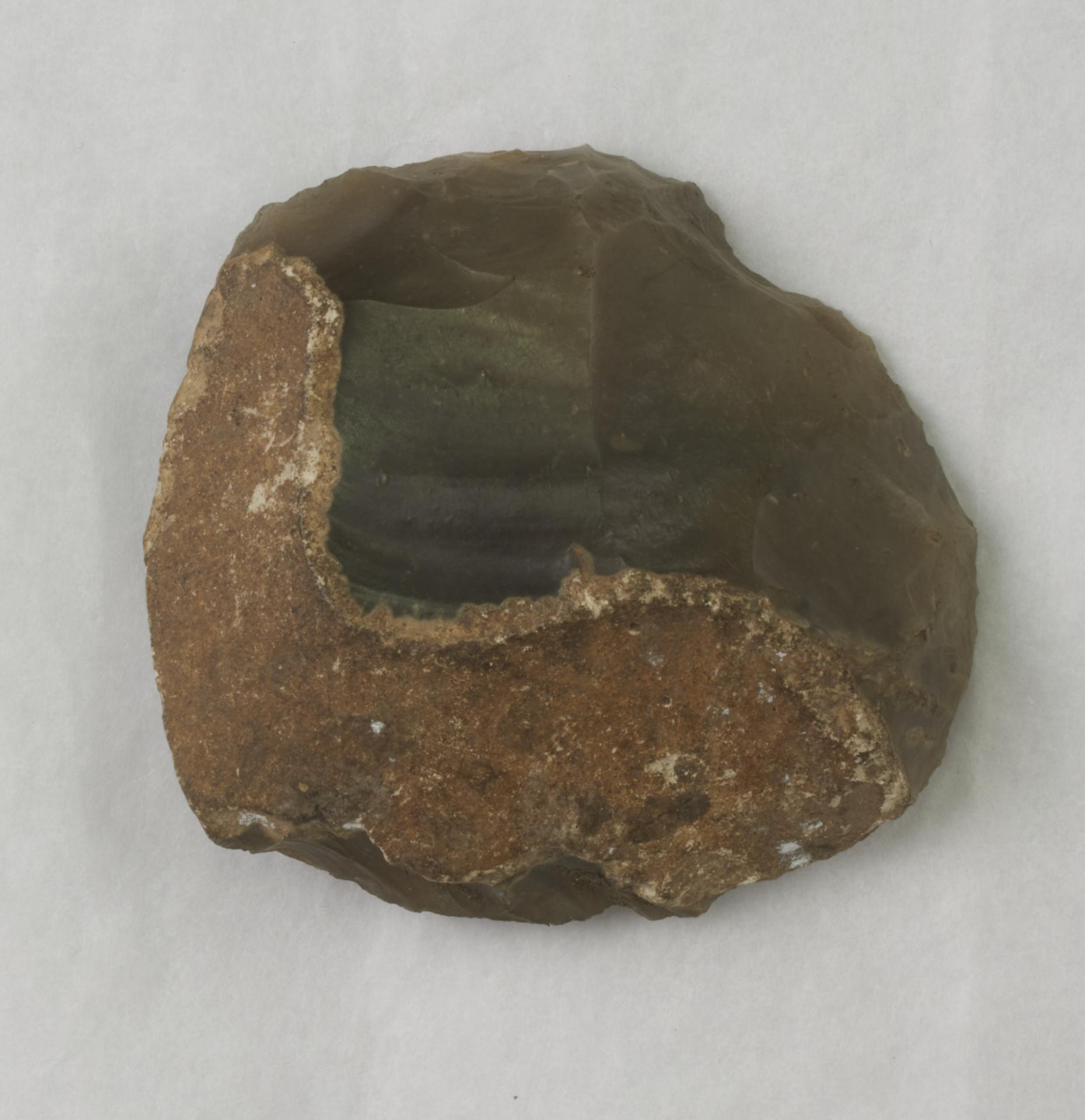 Thick flint scraper. Possibly a disc scraper. Roughly circular in shape.