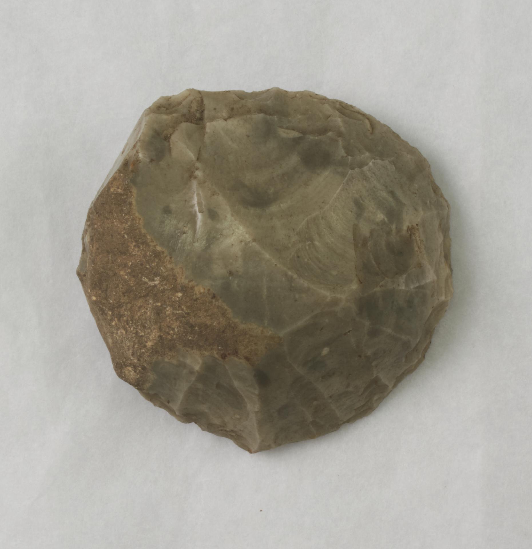Thick flint scraper with possible pressure flaking at the cutting edge. Roughly circular in shape. Possibly a disc scraper. Retouched along almost the whole edge.