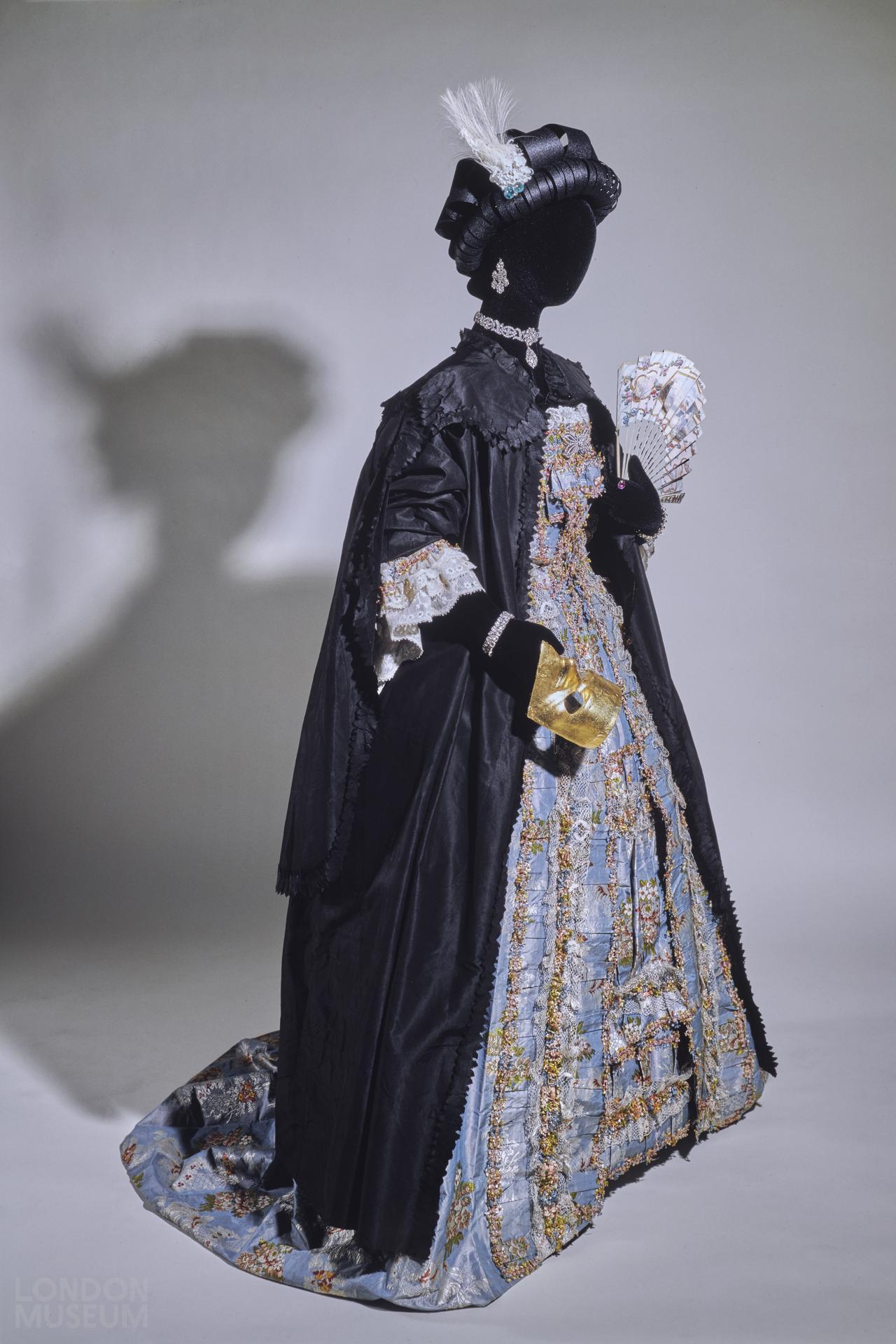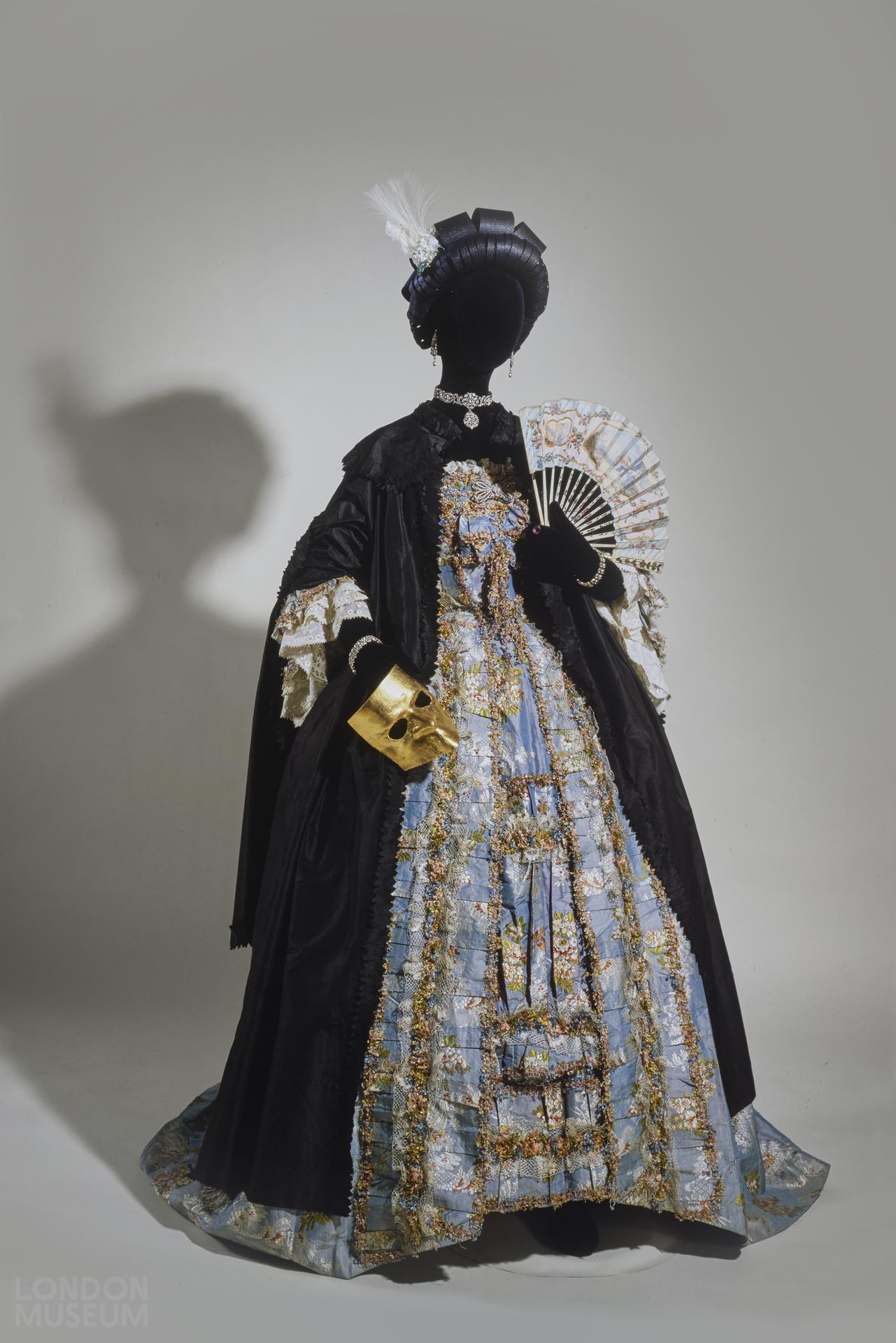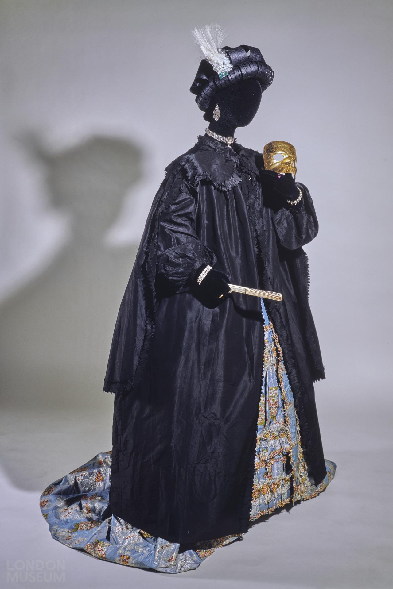 The word 'domino' seems first to have been used for a cloak in England in 1719 (according to the OED). In 1736 it was defined as 'the habit of a Venetian nobleman, very much in use at our modern masquerades'. Fanny Burney in 'Early Journals and Letters' (1988) mentions a 'white sattin' Domino' in 1770.