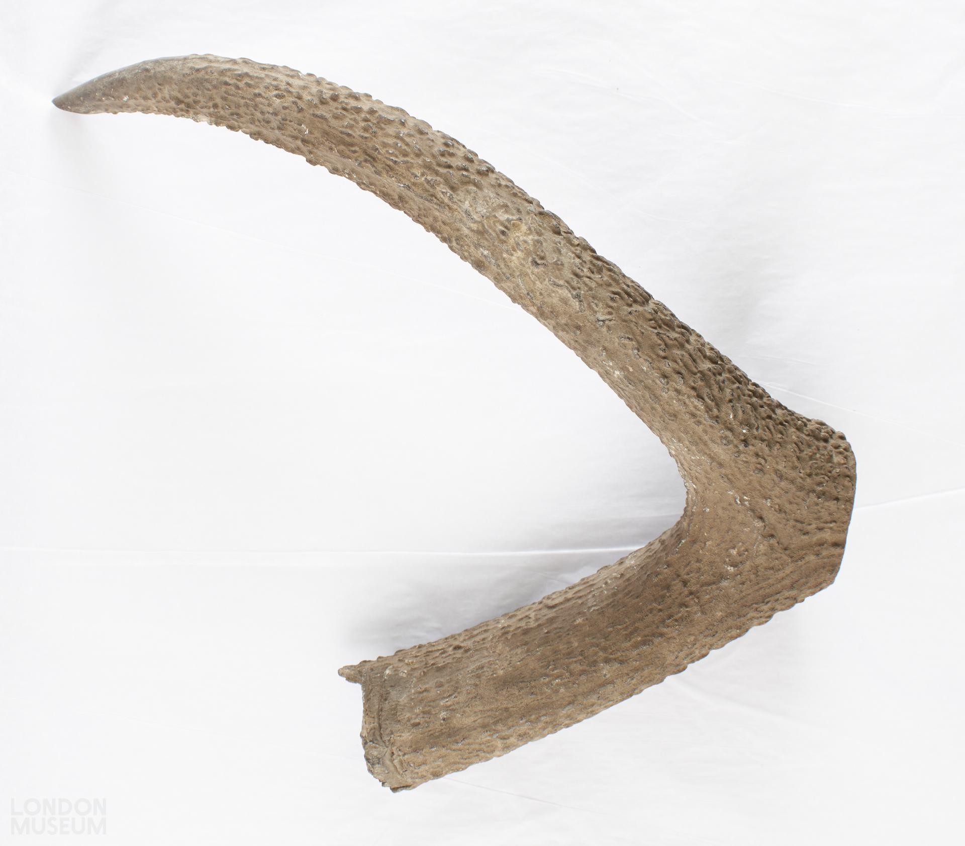 Stag's horn implement, possibly a pick. Base is cut away and flattened. Horn is forked but part has broken off. Horn has a bumpy surface.