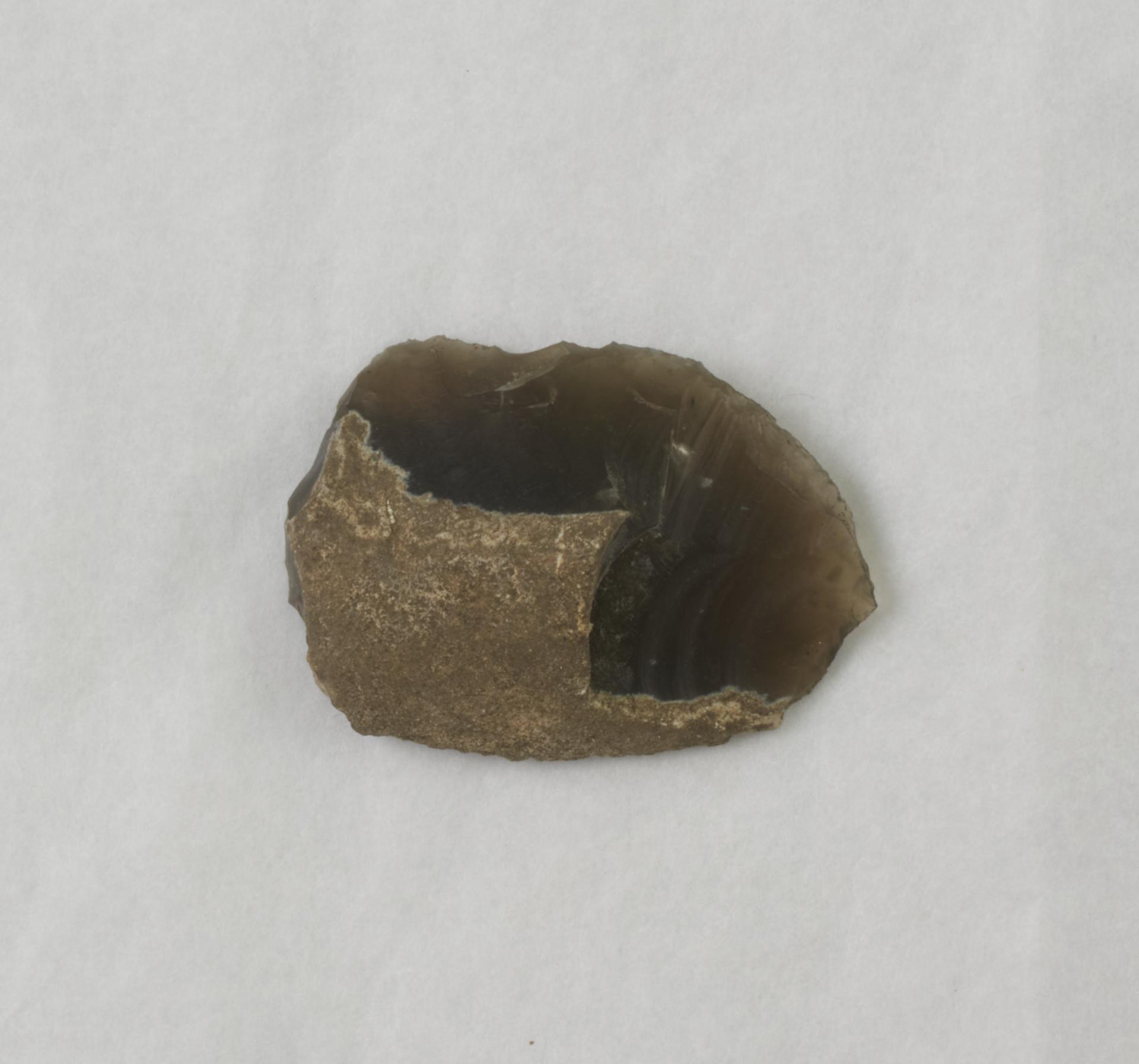 Flint end scraper. Roughly oval in shape. Dark grey in colour. Partial cortex on dorsal side. Other side is smooth.