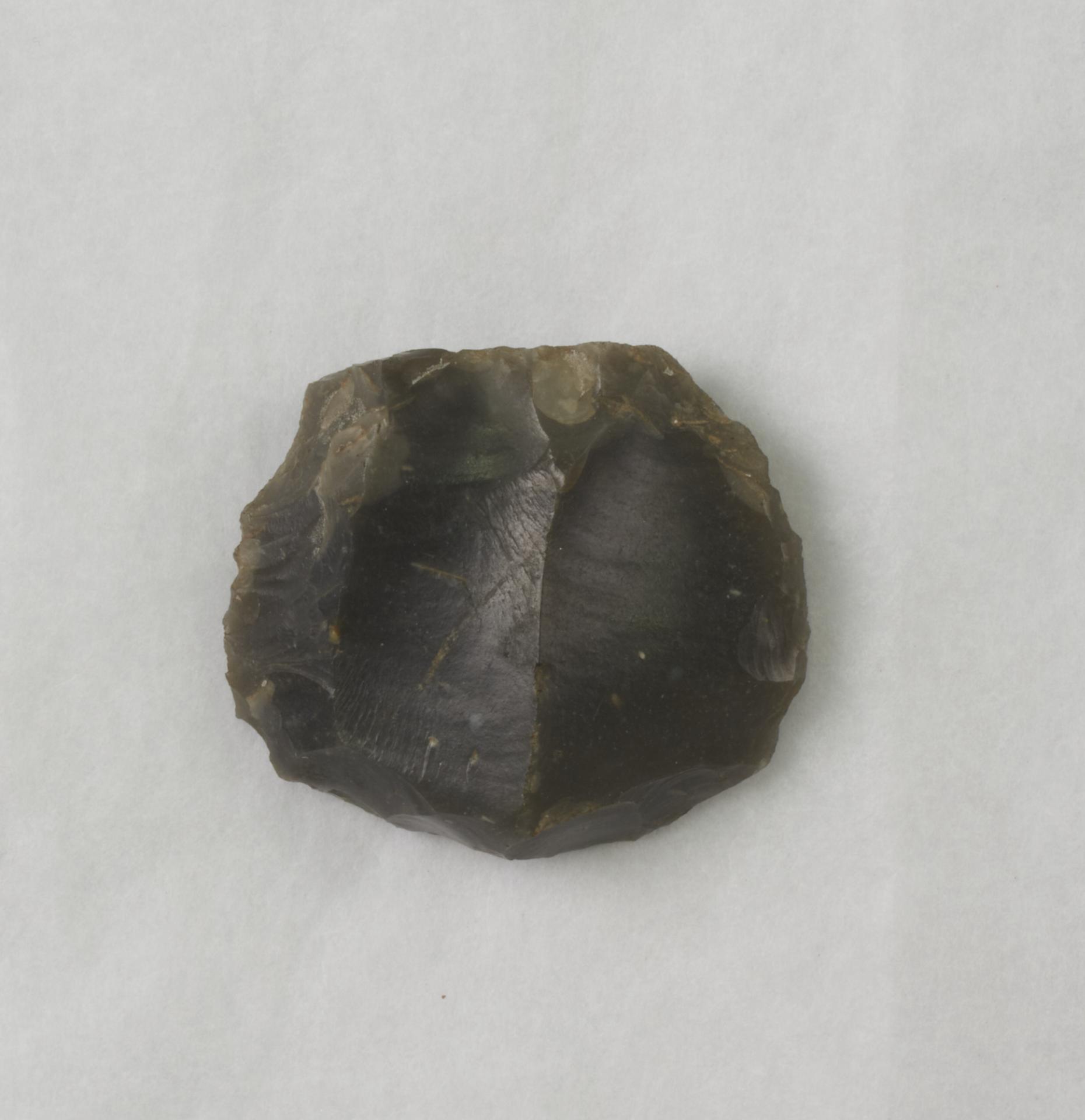 Flint scraper. Possibly a disc scaper. Nearly the whole edge hase been retouched. Roughly circular in shape. Dark grey in colour.