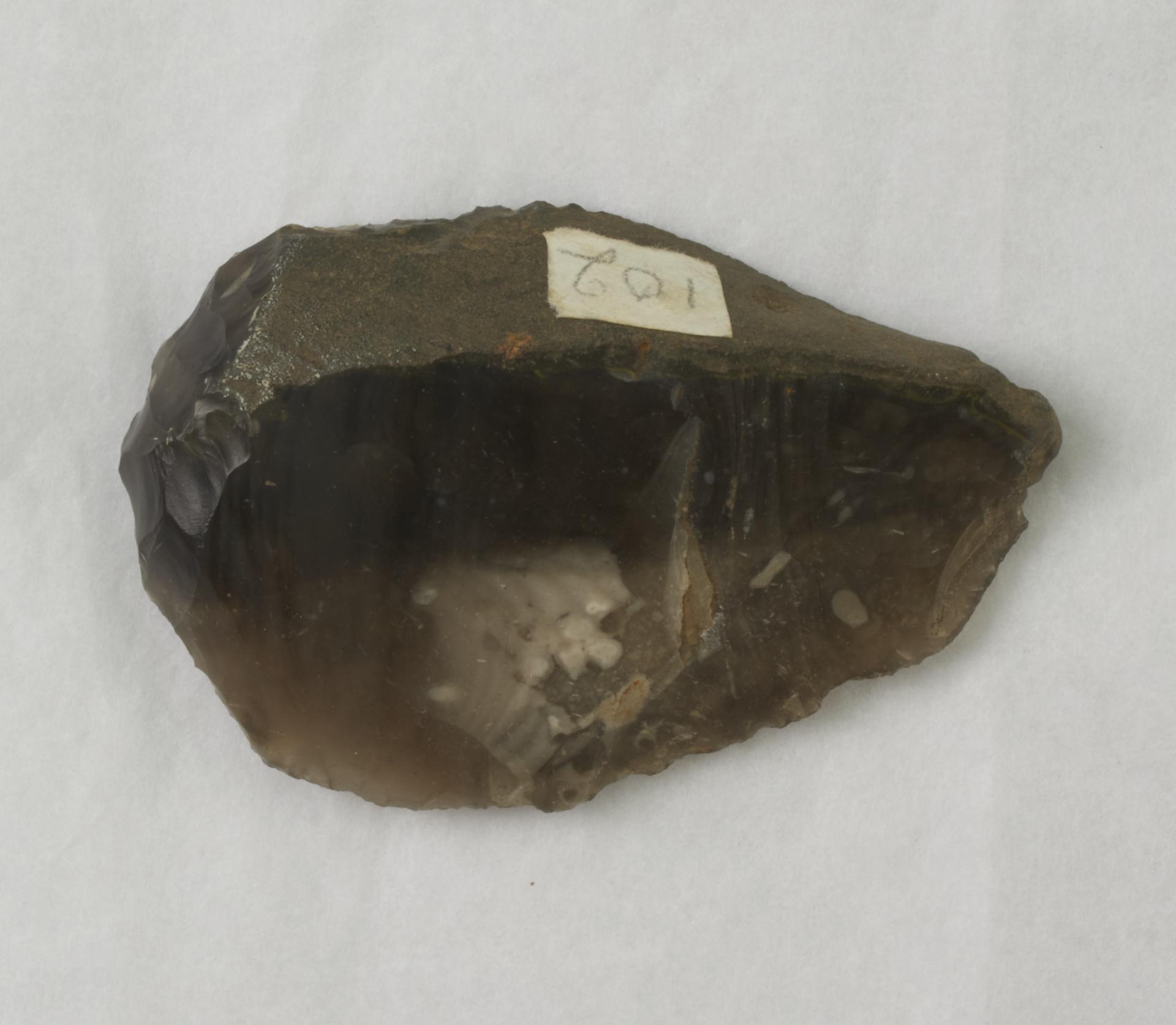 Flint scraper. Possibly a side scraper. One long edge has been retouched. Roughly oval in shape.